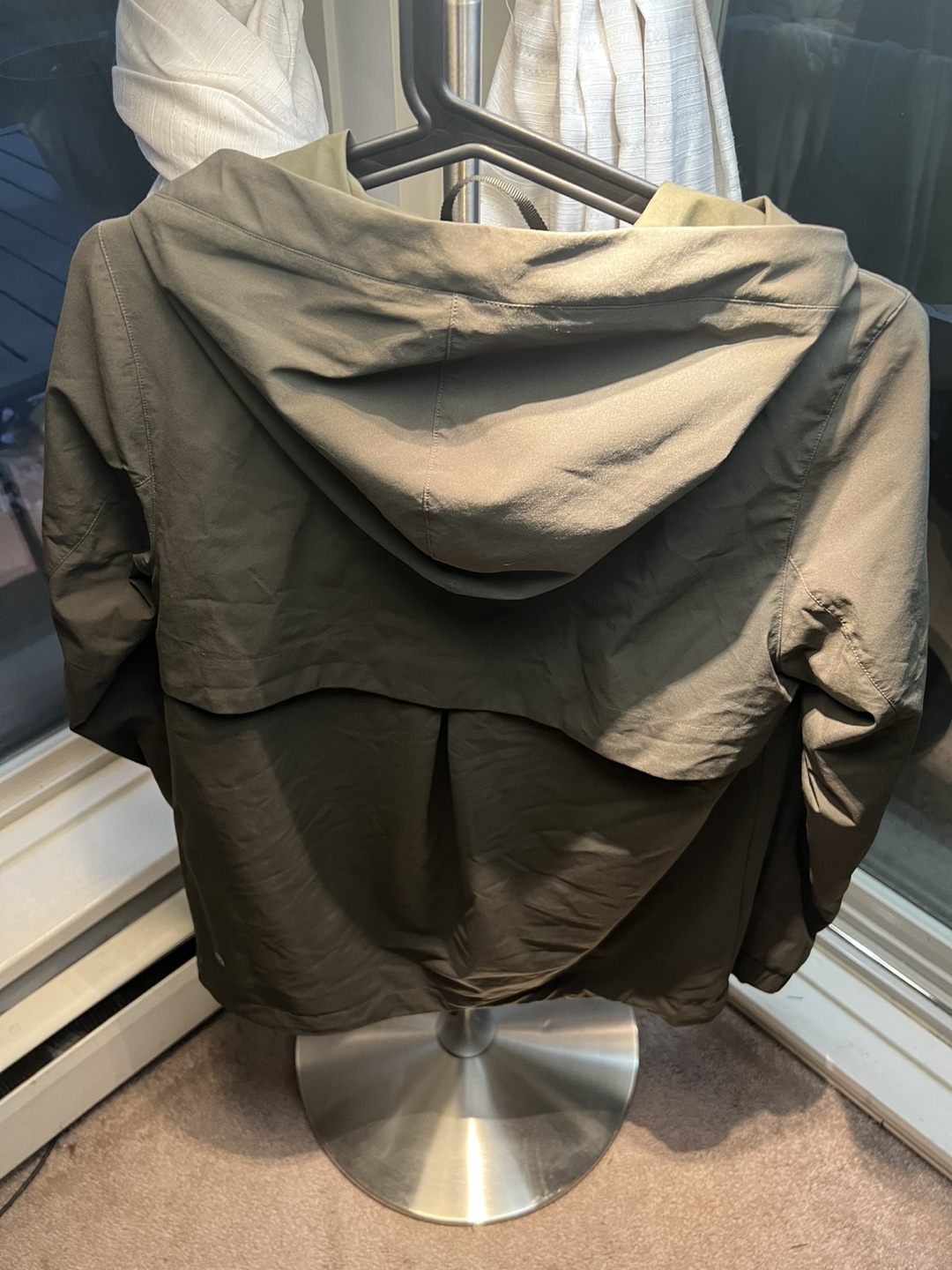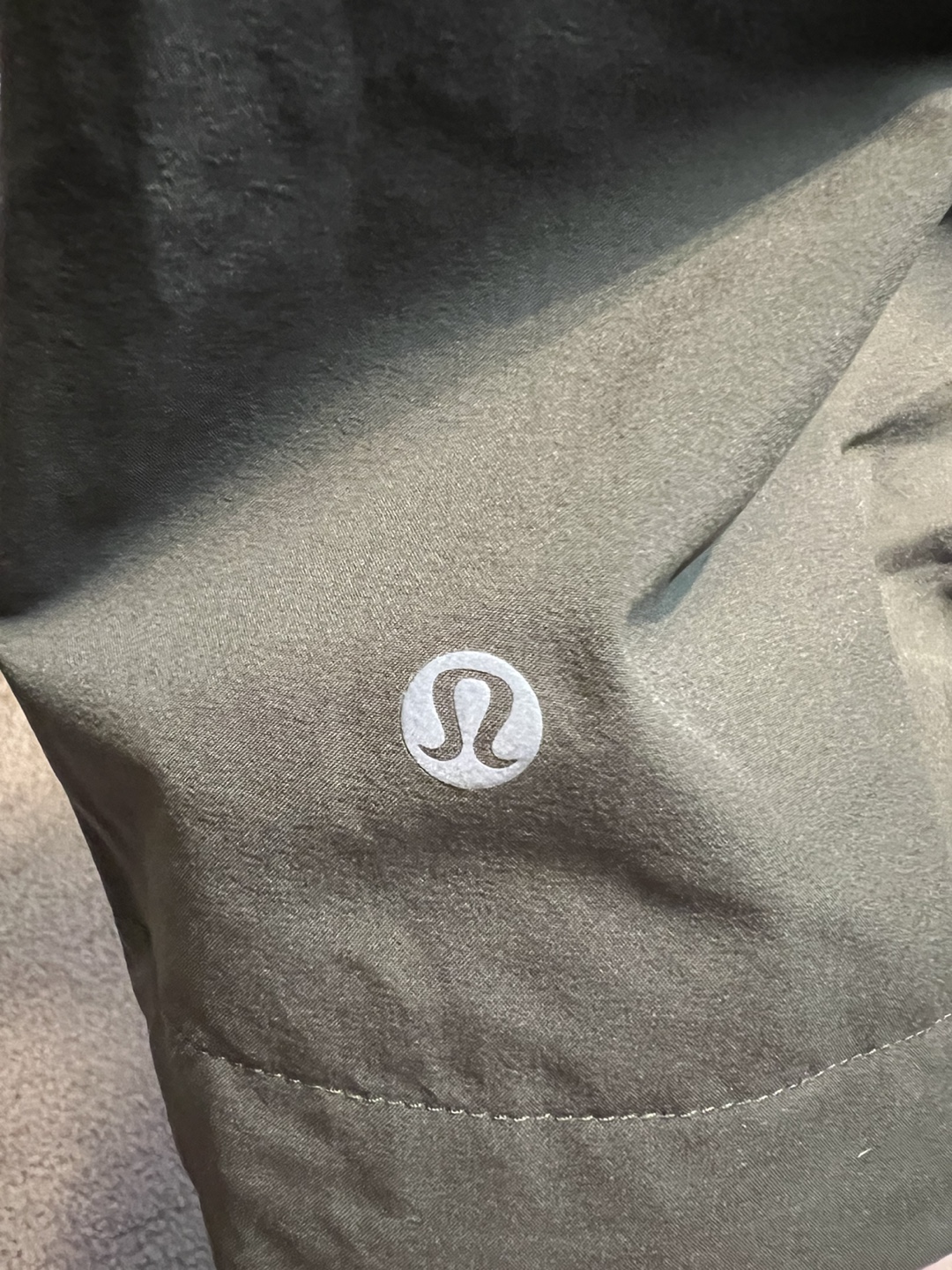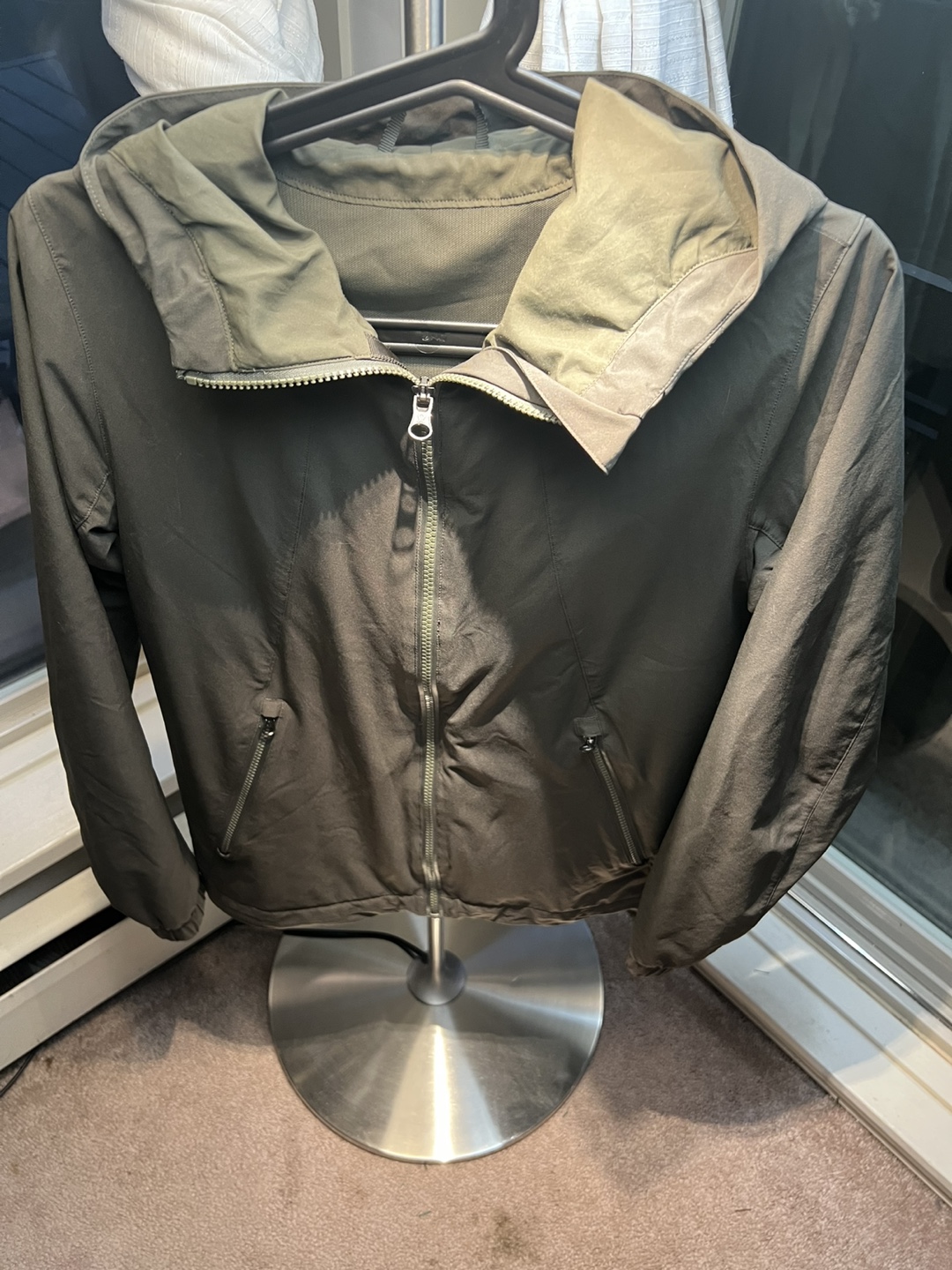 Lululemon jacket in dark olive. Features a hood and zipper closure. Made with wind and water-resistant material.