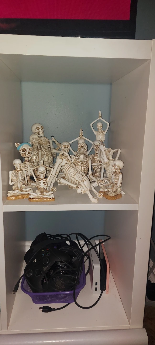 A collection of white skeleton figurines posed in various yoga positions and social groupings.