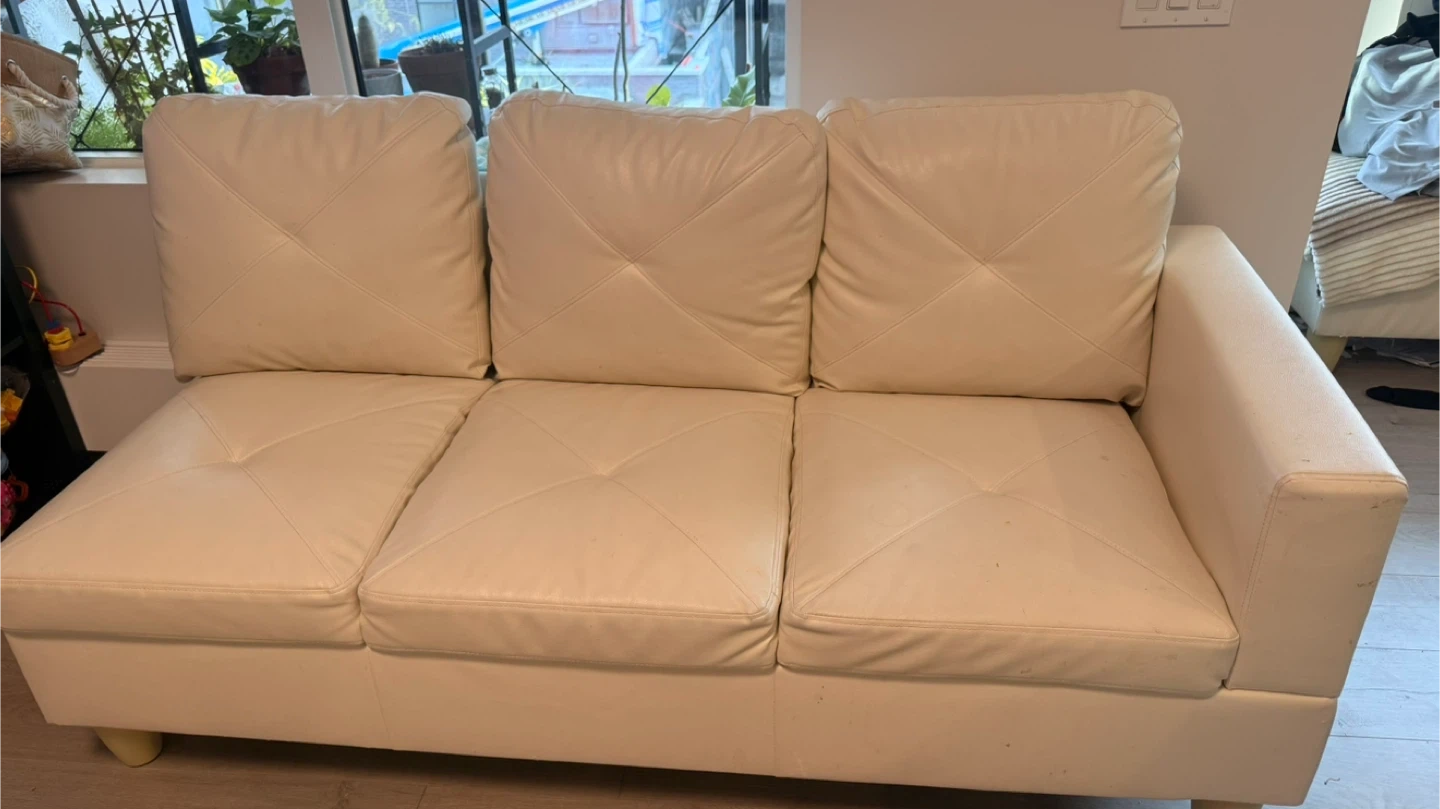 L shape couch. Plus one extra couch of same design. Can be altered in various ways according to the design of your space. White faux leather is easy to clean mess. Couch has a good firmness and comfy and elegant with the way you present it. I took the pics in a hurry and couldn’t do justice to the pic. However, you will be lucky to have it in your space as it is enriched with elegance.