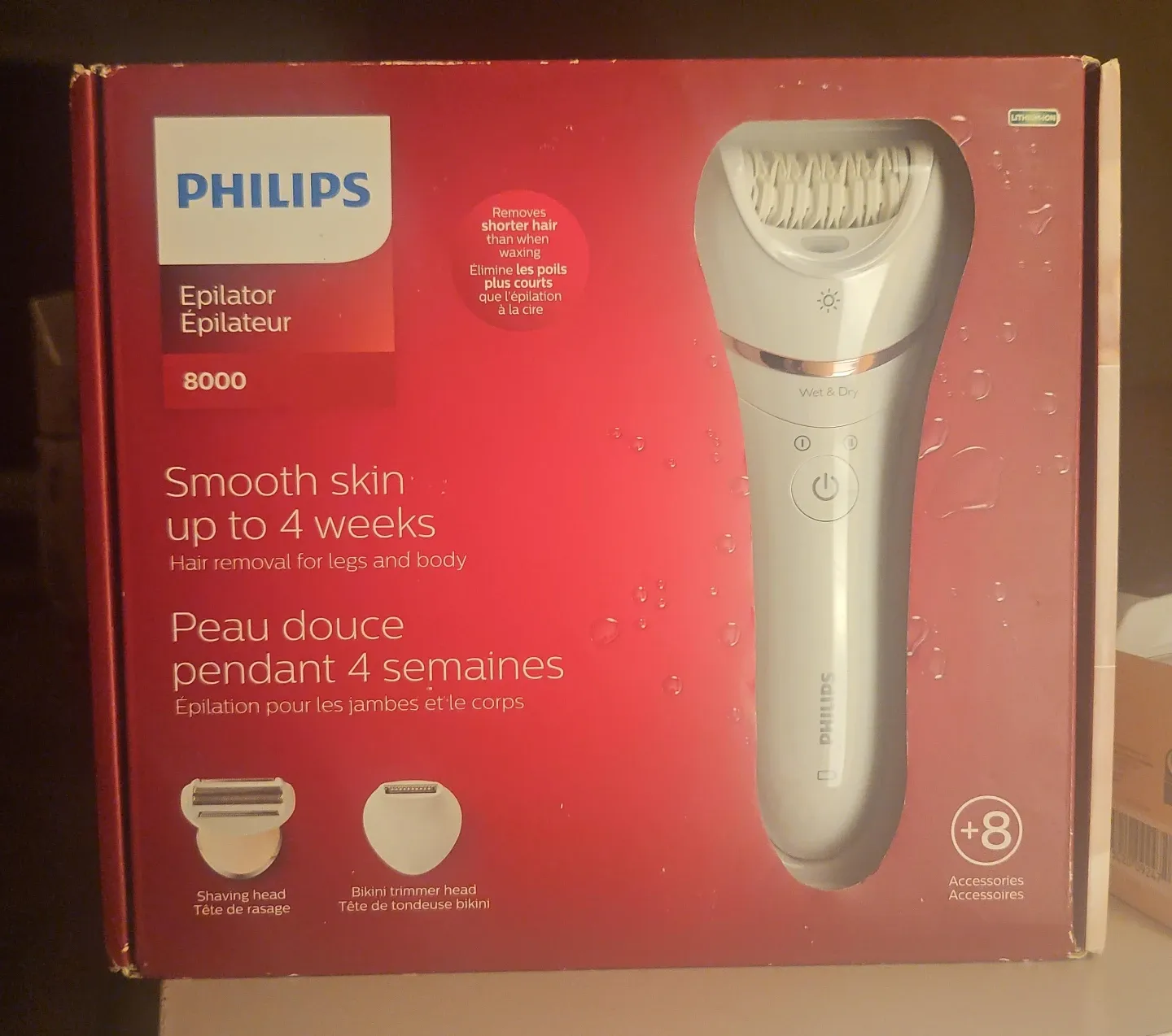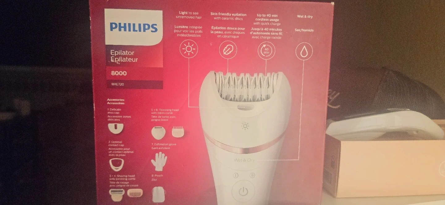 This Philips Epilator 8000 series offers smooth skin for up to 4 weeks. It's designed for legs and body hair removal and is Wet & Dry safe. Includes shaving head, bikini trimmer head, and over 8 accessories.