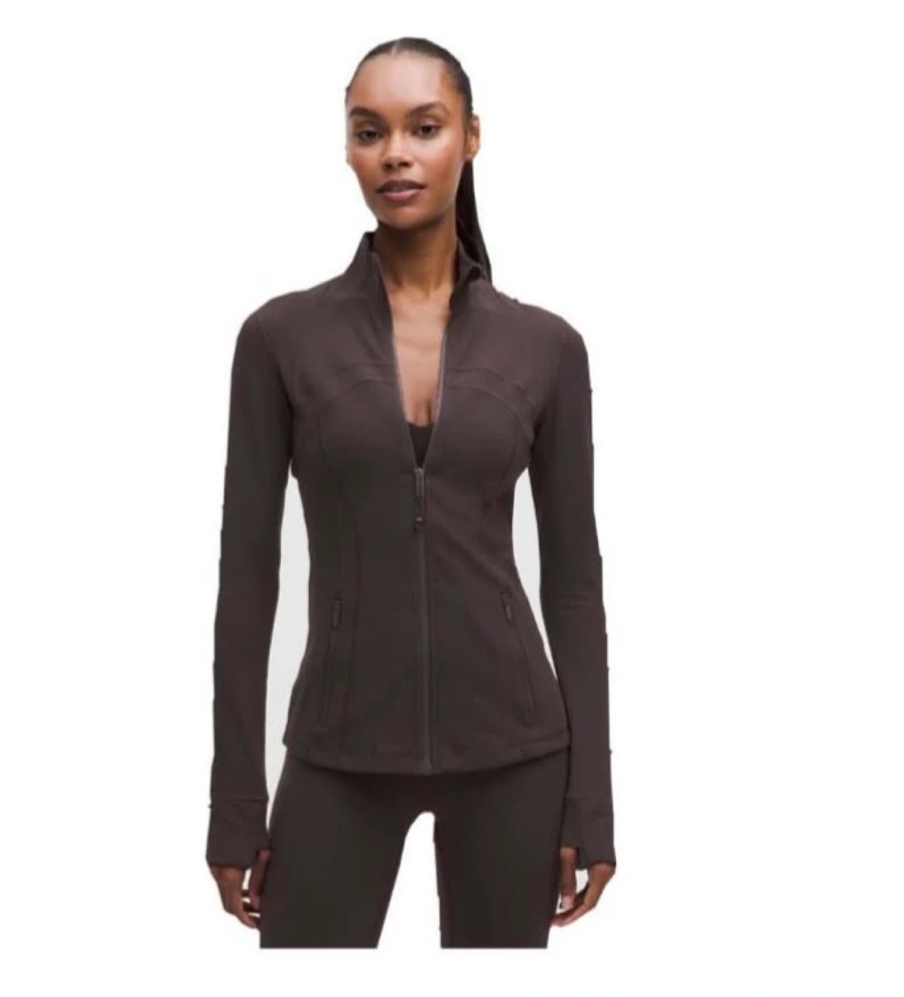 Brown athletic full zip jacket. It's made of a stretchy material and has thumbholes. Zips up the front with zippered pockets.