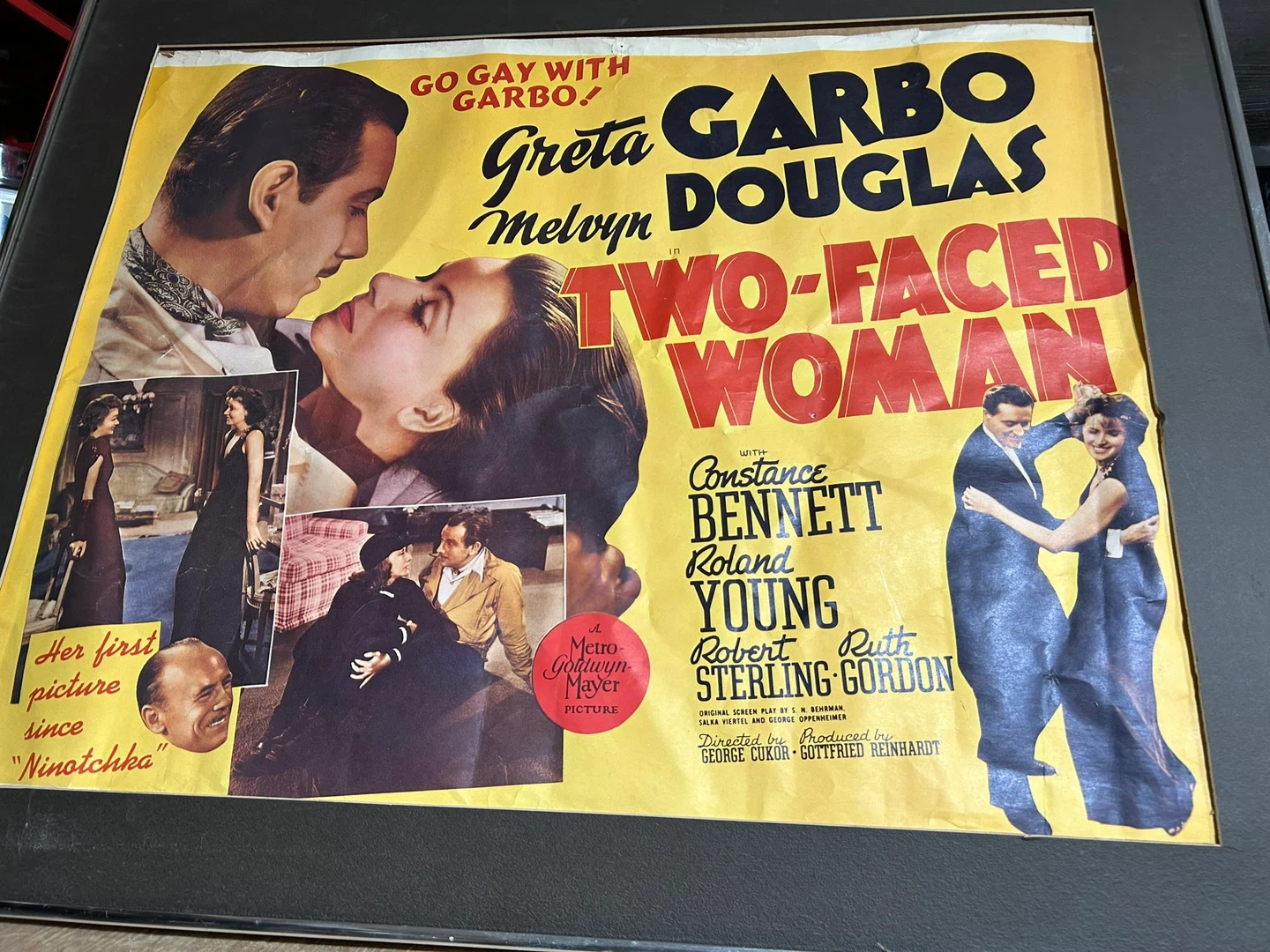 This is a movie poster for the 1941 film Two-Faced Woman. It stars Greta Garbo and Melvyn Douglas. The poster also features Constance Bennett, Roland Young, Robert Sterling, and Ruth Gordon. It's a Metro-Goldwyn-Mayer picture. It mentions this was Garbo's first picture since "Ninotchka".