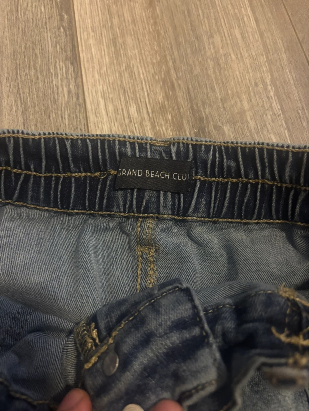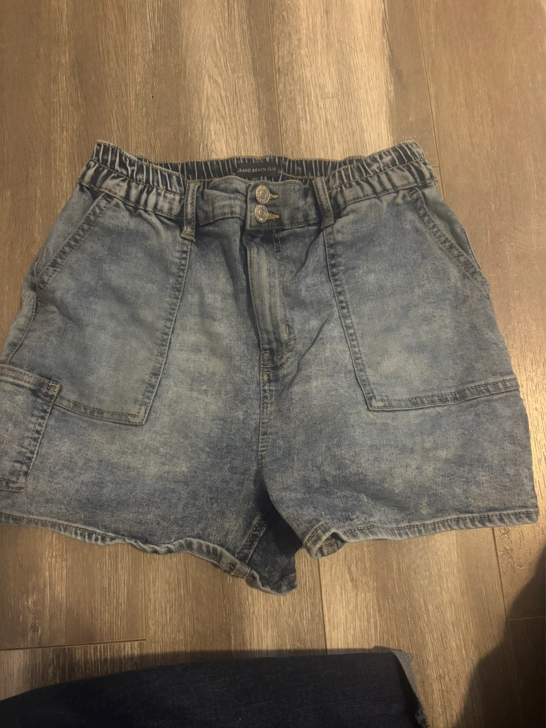 Denim cargo shorts from Grand Beach Club. Features an elastic waistband and two front pockets. Made of 68% cotton, 30% polyester, and 2% rayon. These shorts are great for casual wear. Size Women's 4