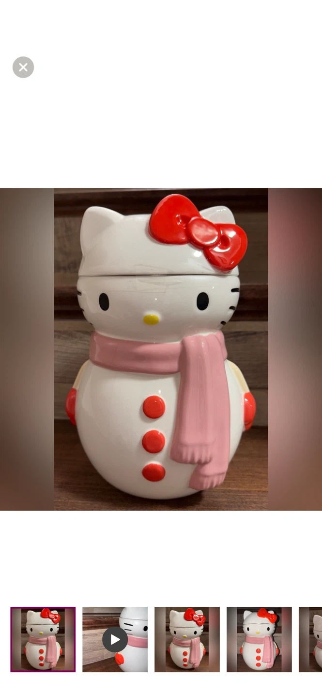 This cute ceramic treat jar features Hello Kitty dressed as a snowman. It's perfect for storing cookies or other goodies. The jar measures approximately 7 inches tall. Great for any Hello Kitty fan's kitchen!