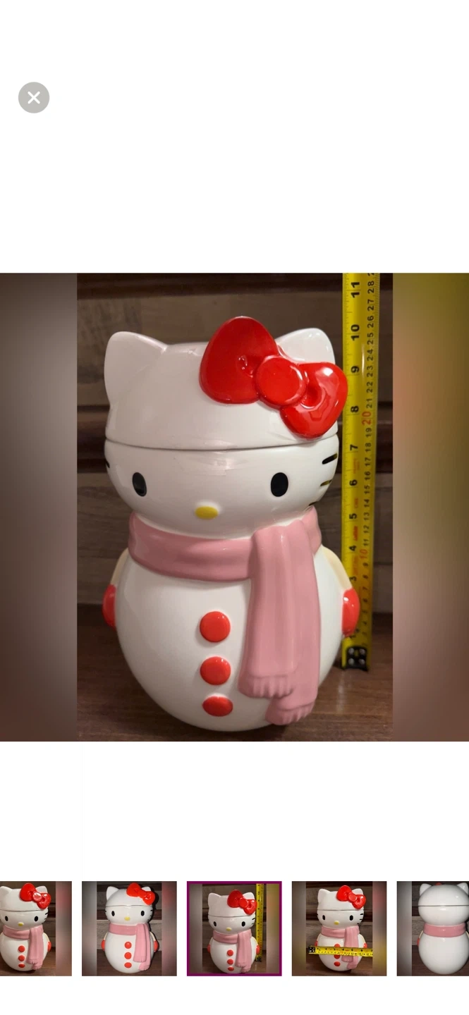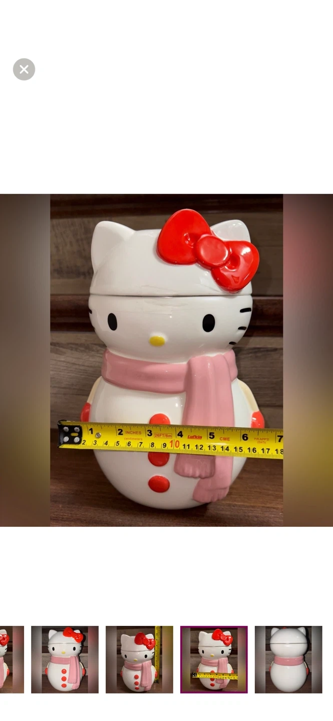 This cute ceramic treat jar features Hello Kitty dressed as a snowman. It's perfect for storing cookies or other goodies. The jar measures approximately 7 inches tall. Great for any Hello Kitty fan's kitchen!