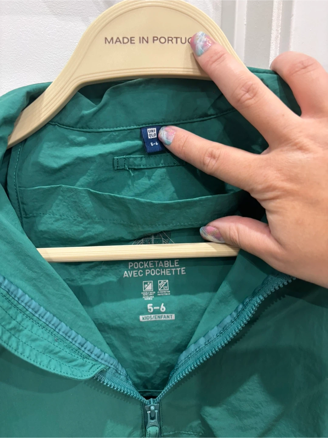 This Uniqlo jacket is green and size 5-6. It's pocketable, lightweight, and great for layering!
