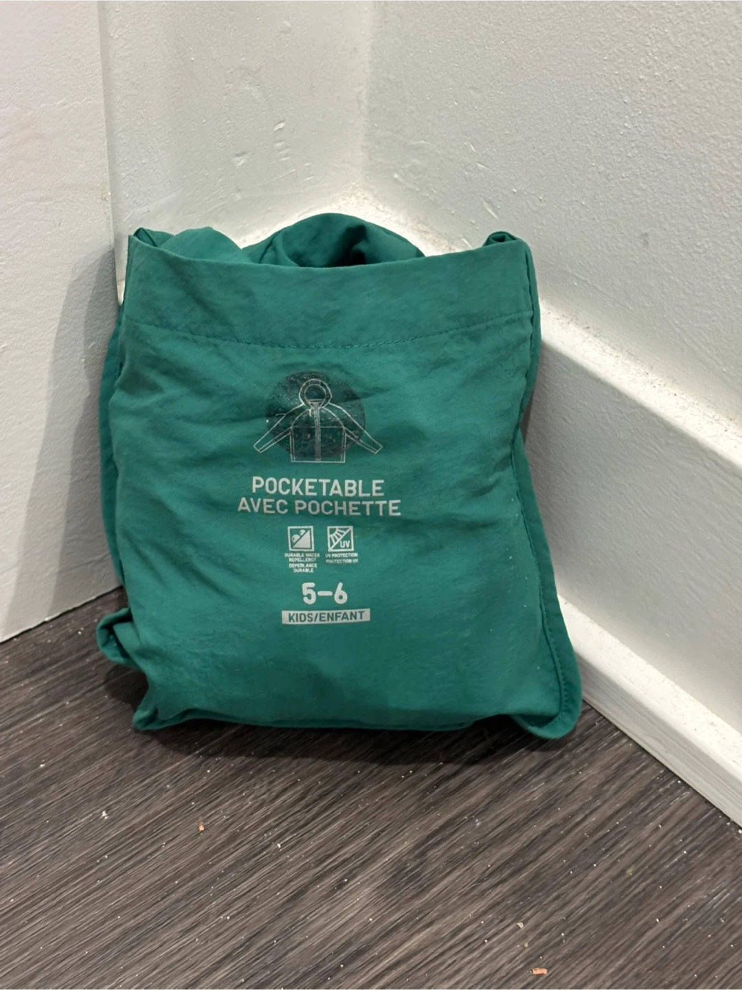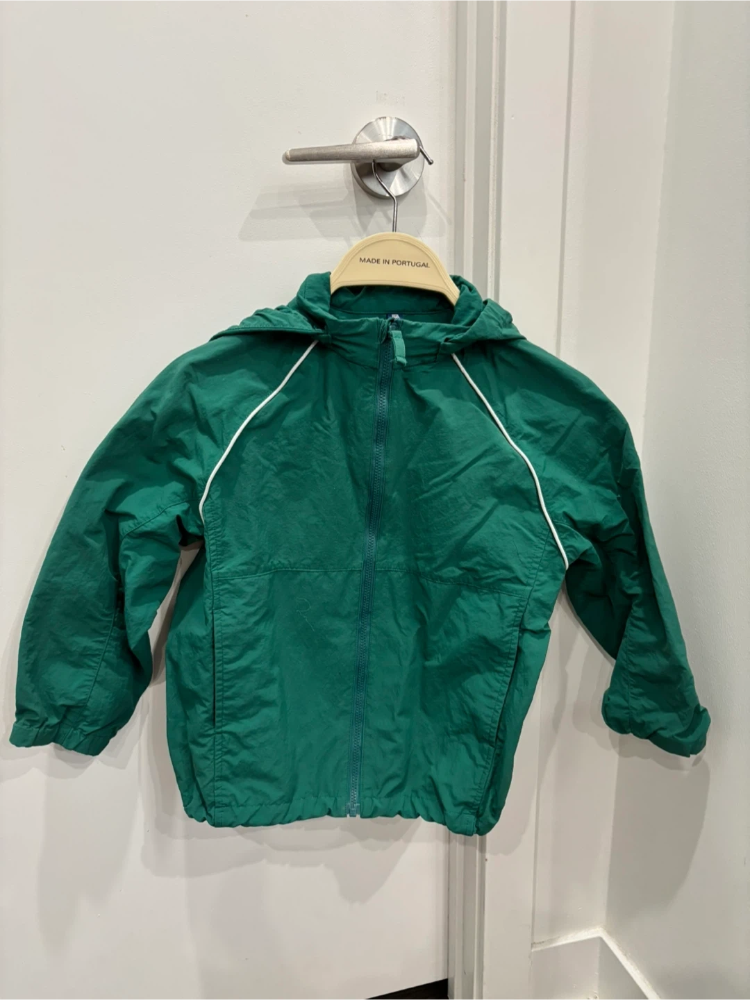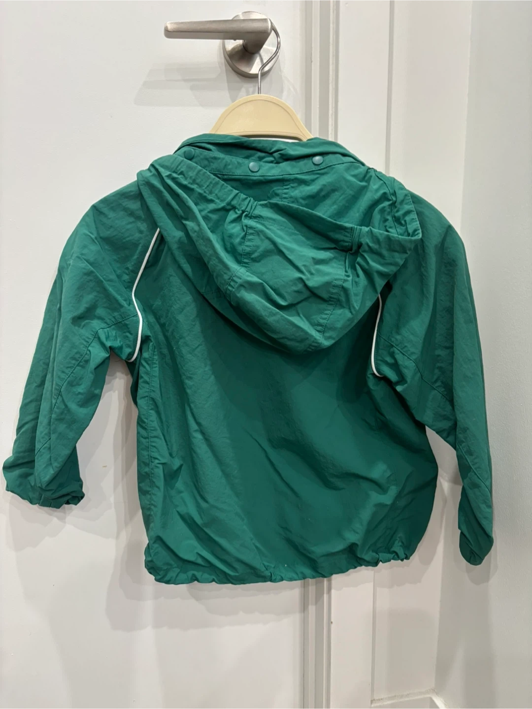 This Uniqlo jacket is green and size 5-6. It's pocketable, lightweight, and great for layering!