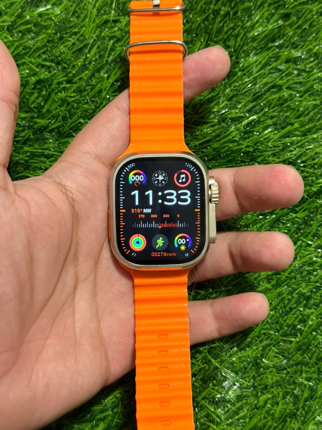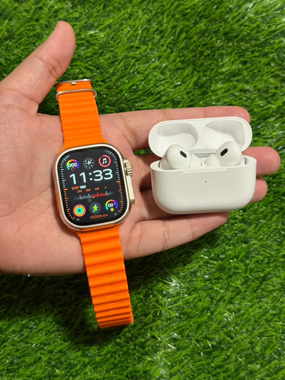 This bundle includes a smartwatch with an orange band and a pair of wireless earbuds with a charging case. It also comes with multiple interchangeable watch bands in various colours and designs, plus a protective watch case. All components are neatly packaged.
