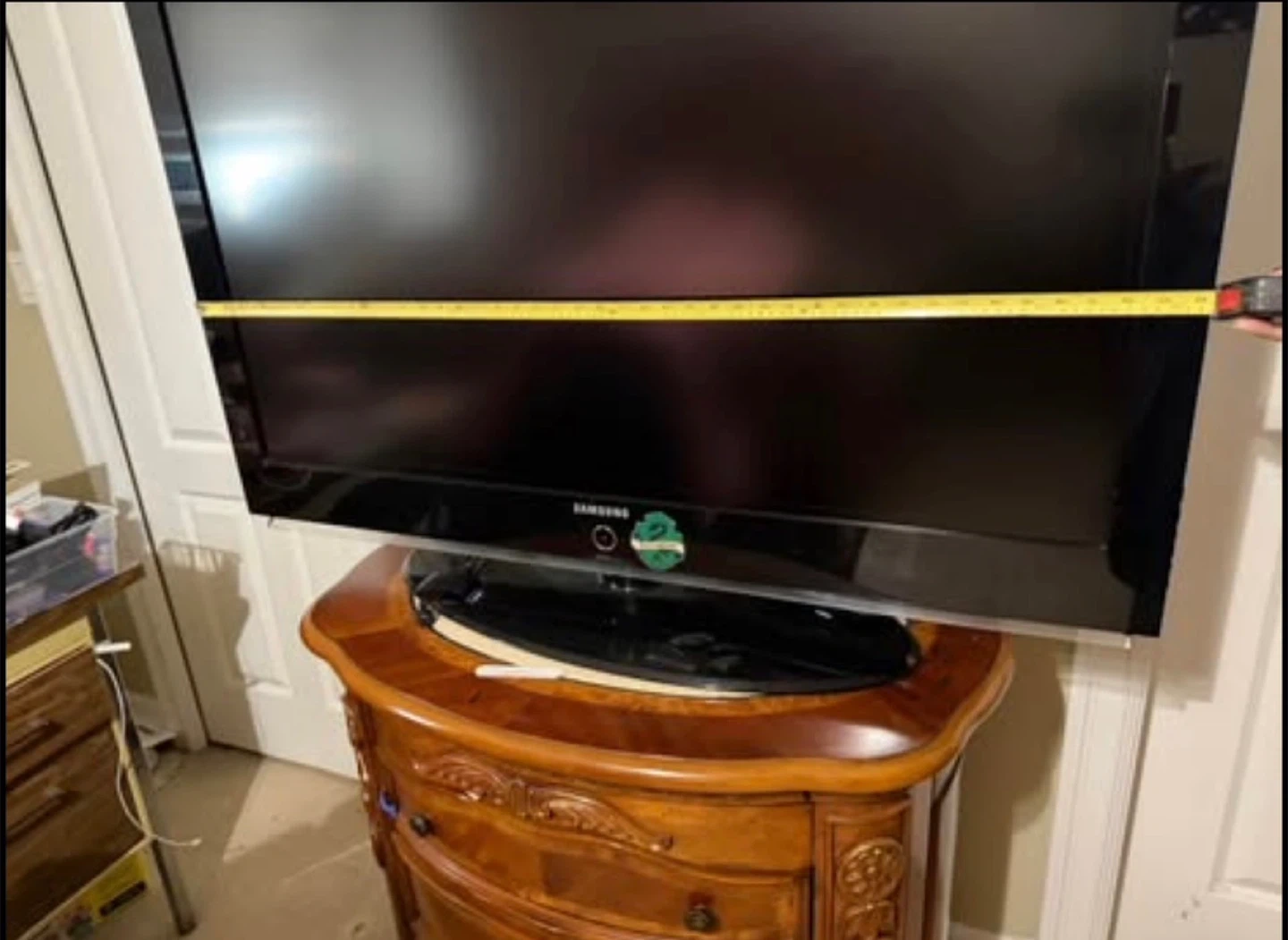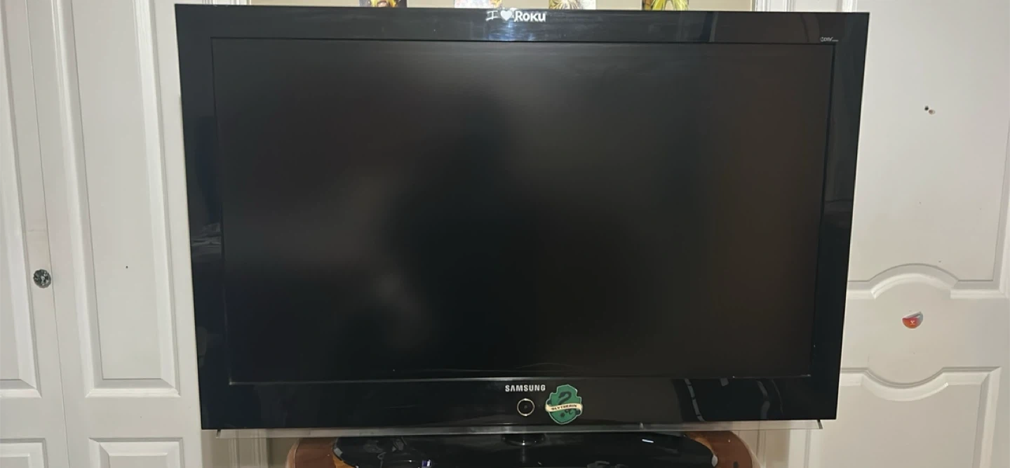 Samsung 32-inch flat-screen TV with Roku. This TV has a black frame and a pedestal stand. It's functional and ready for a new home!