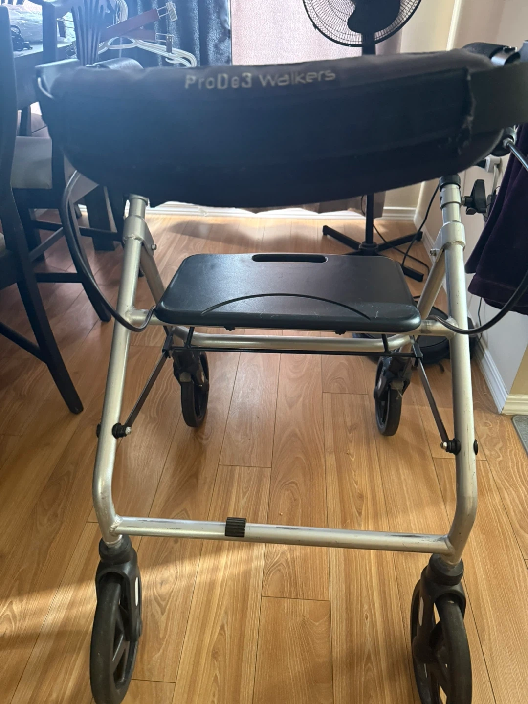 This ProDeg3 Walkers rollator is silver with black seating and handles. It has four wheels, a seat, and brakes. It's designed for mobility assistance.