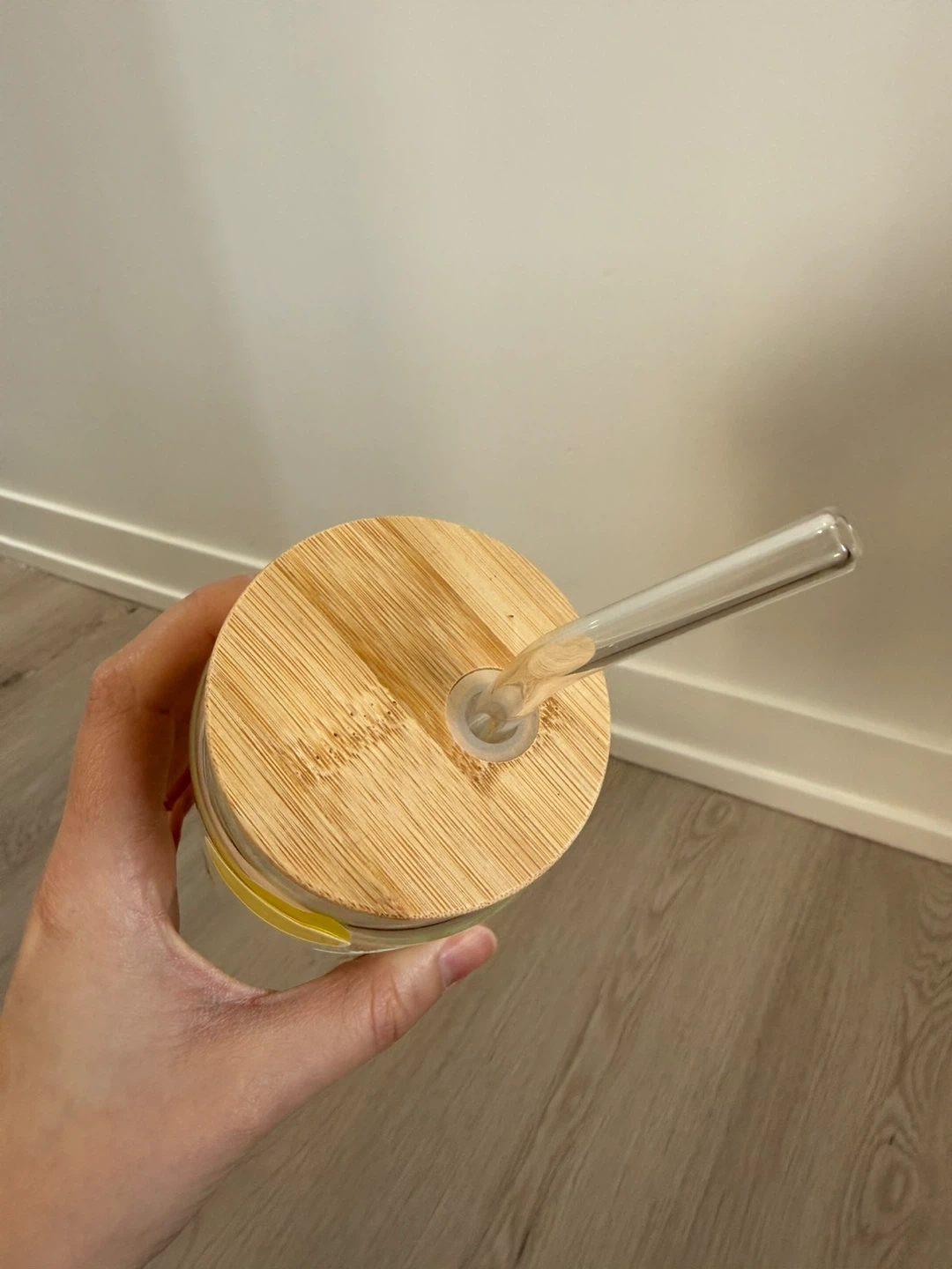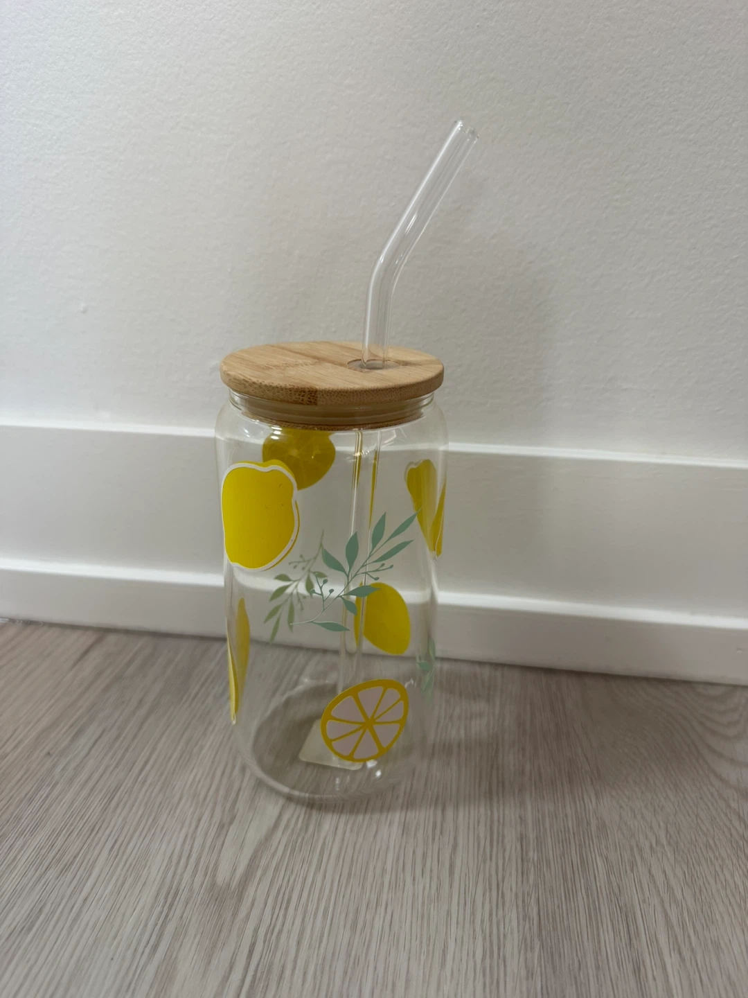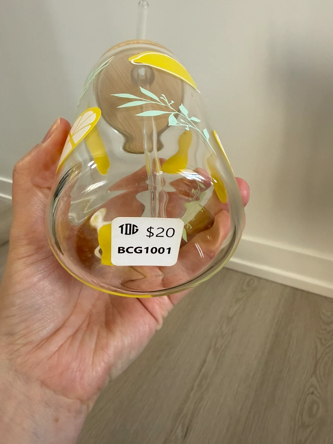 Brand new! Got this at a craft show and never ended up using it. Glass cup with bamboo lid and glass straw. Handwash gently. Meant for cold drinks like iced coffees, etc. smoke free home.