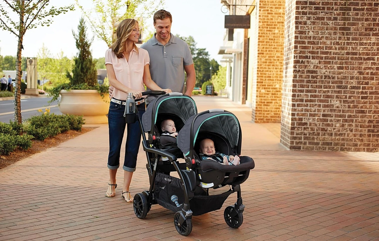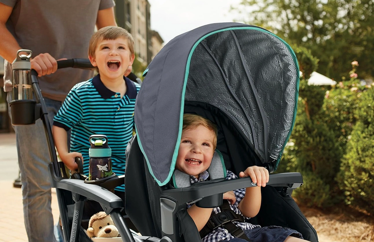 The most versatile double stroller! With 27 riding options, from infant to youth, you can configure this stroller for the best fit for your growing family. The Graco Modes Duo Stroller accepts Two Graco Click Connect Infant Car Seats, connecting with a secure one-step attachment. It has a standing platform and bench seat for your older child, and two reclining, removable seats that allow for stroller customization. Convenience and comfort features include locking front swivel wheels for increased maneuverability, extra platform wheels, one-handed standing fold, and pivoting child's arm bar with cupholders. The Graco Modes Duo Stroller helps you get the most out of every ride!
