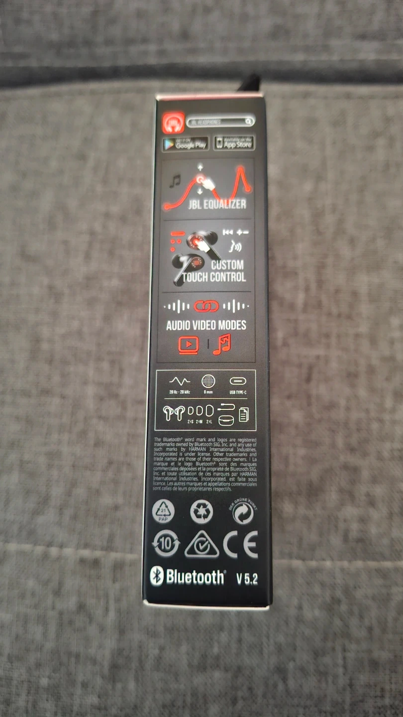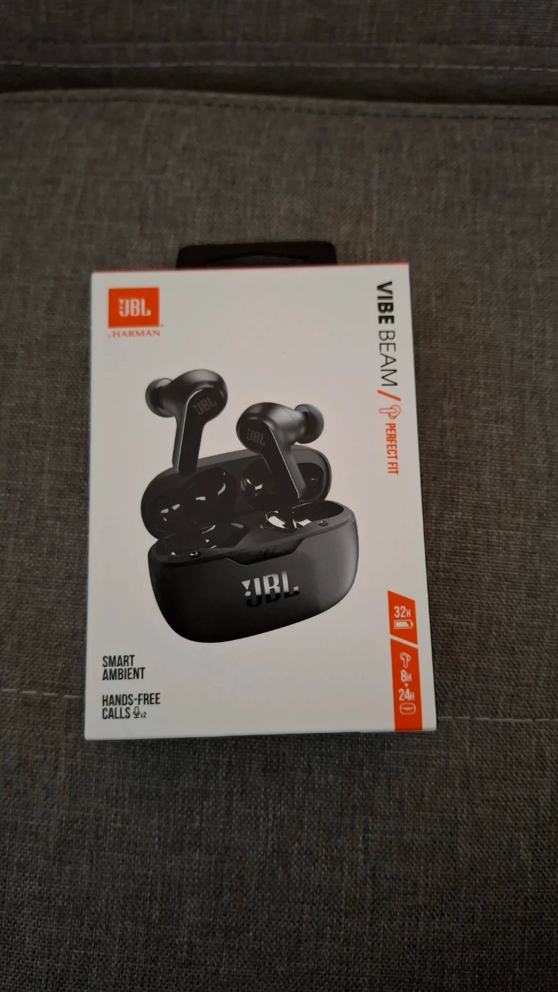 JBL Vibe Beam true wireless earbuds with deep bass sound. They're black and feature hands-free calls and custom touch control. Includes USB Type-C charging.