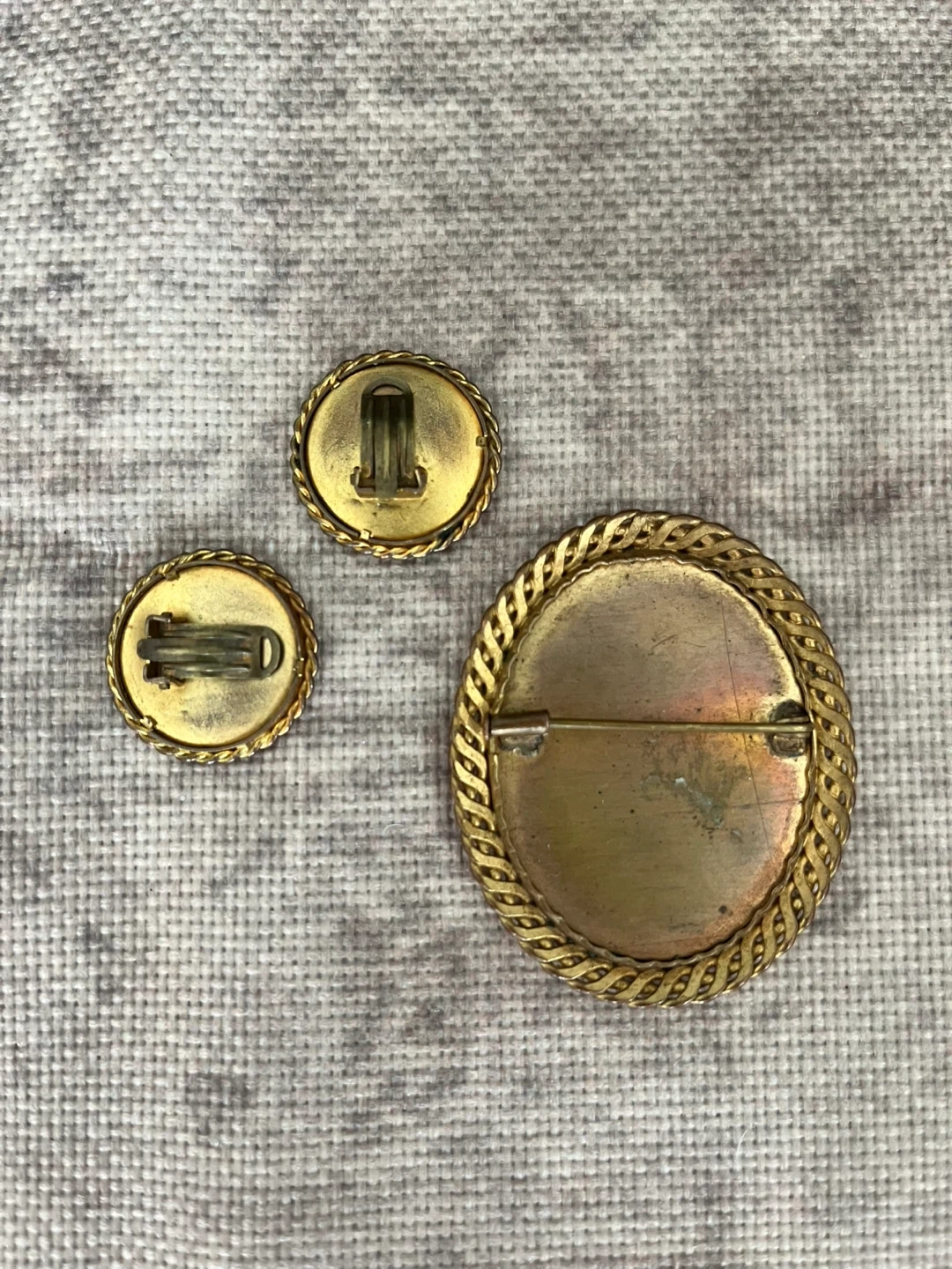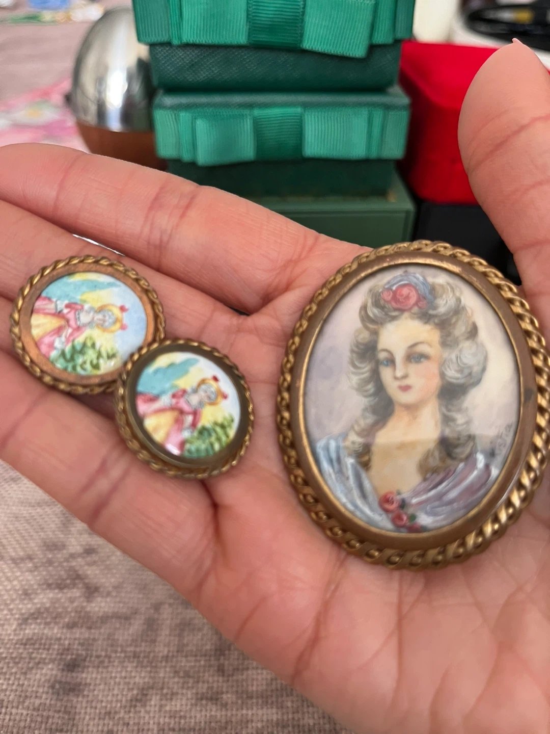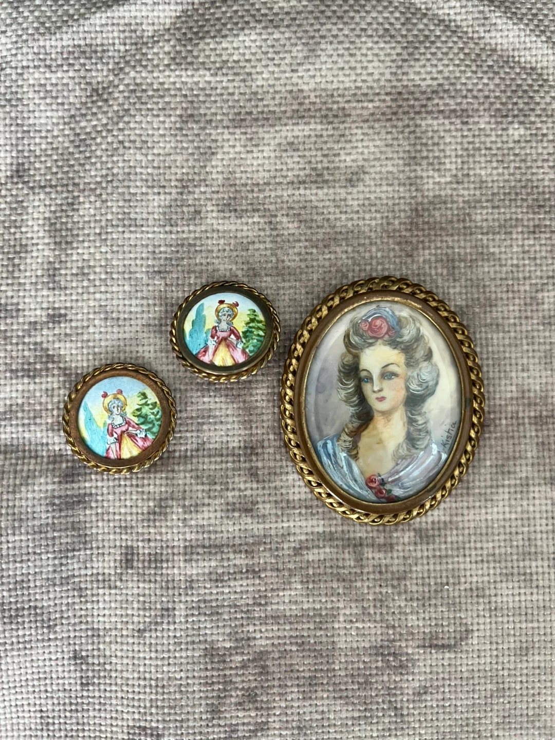 This set includes a vintage brooch and two matching clip-on earrings. Each piece features a miniature painted portrait with a decorative gold-tone metal frame. They're all approximately the same size.