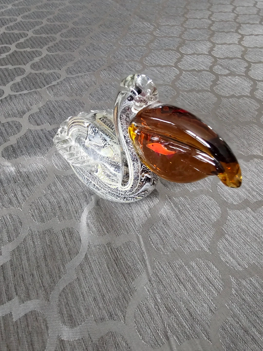 Decorative glass figurine of a pelican. It has a clear body with swirled detailing and an amber beak. This piece adds a touch of charm to any space.🧡