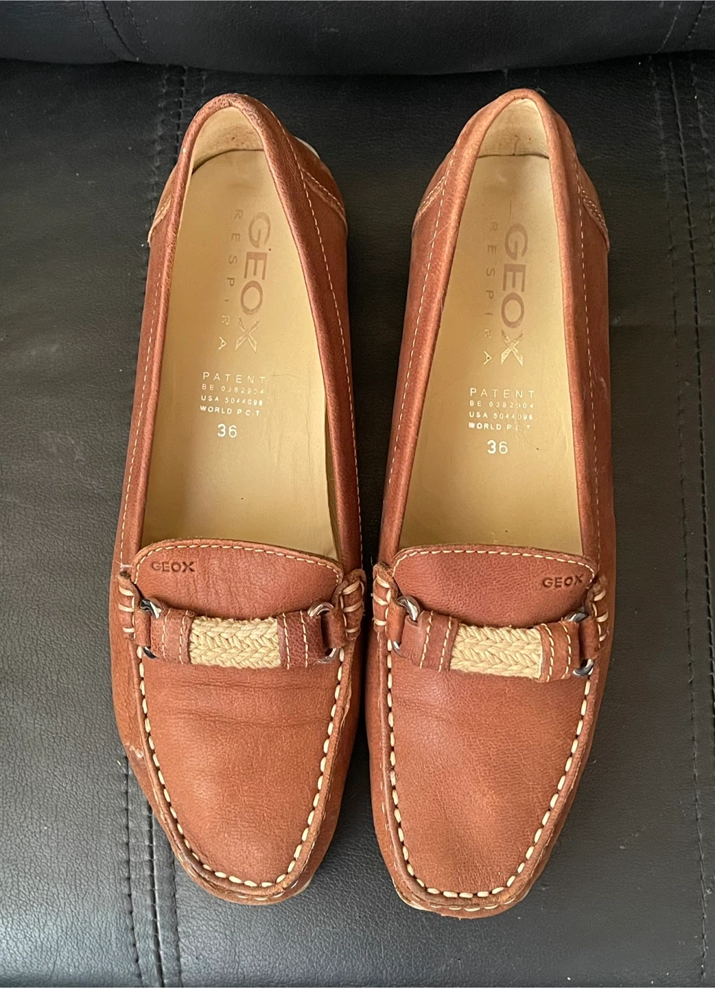 These are Geox women's loafers in a brown leather. They're a size 36 with Geox's Respira technology for breathability. These shoes are stylish and comfortable for everyday wear. Very good condition.