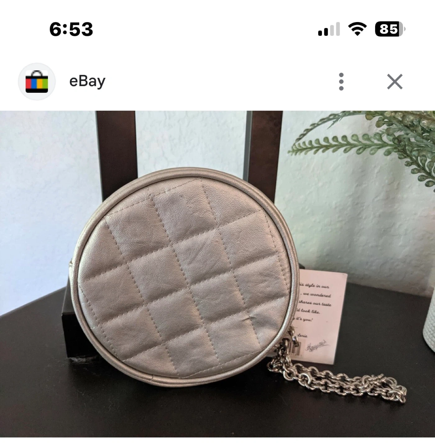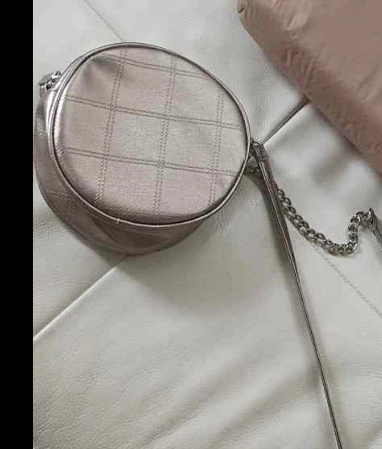 This Murval bag has a stylish quilted design and a metallic finish. It includes a silver chain strap for crossbody wear. Round shape with a secure closure.
