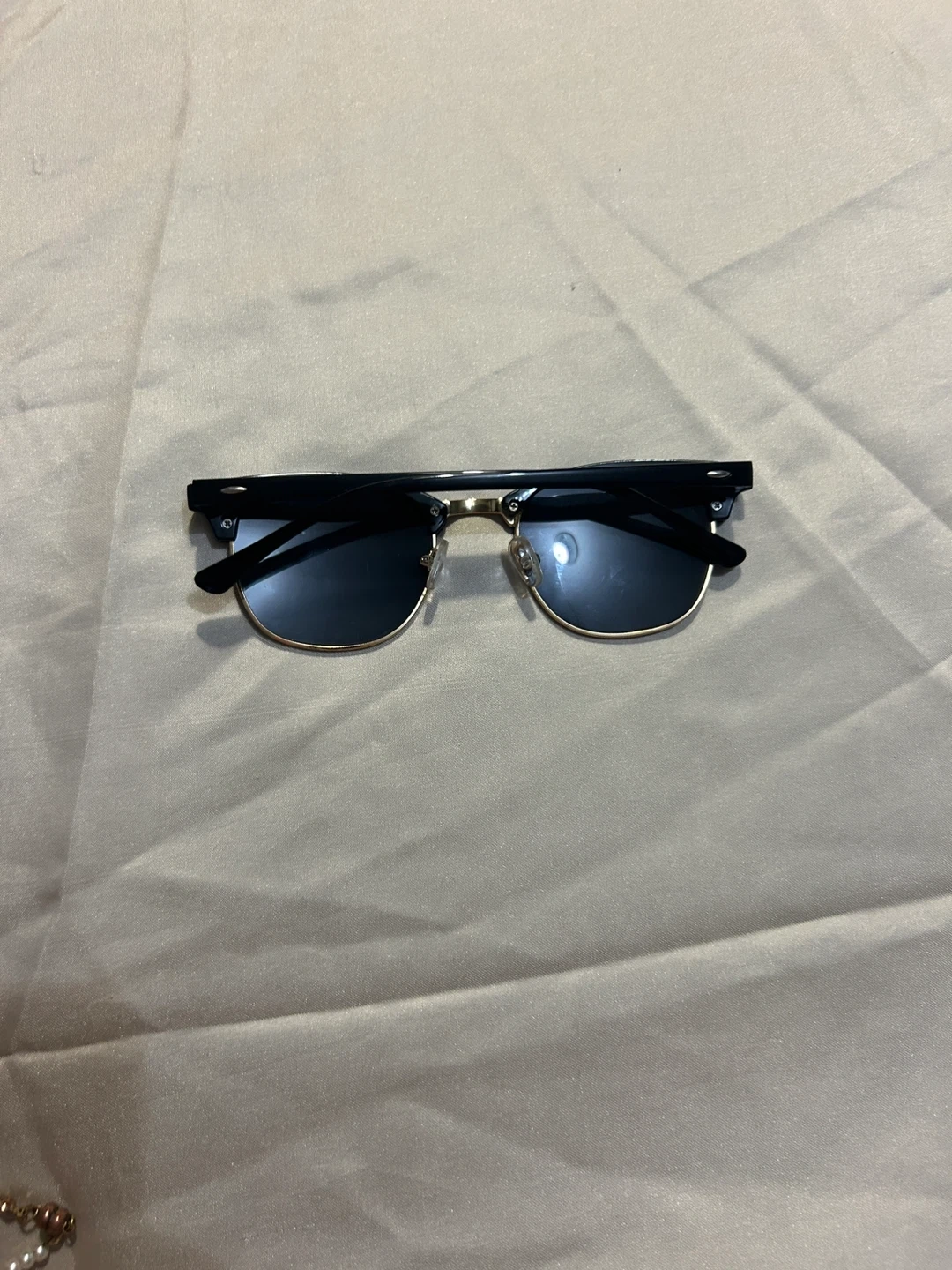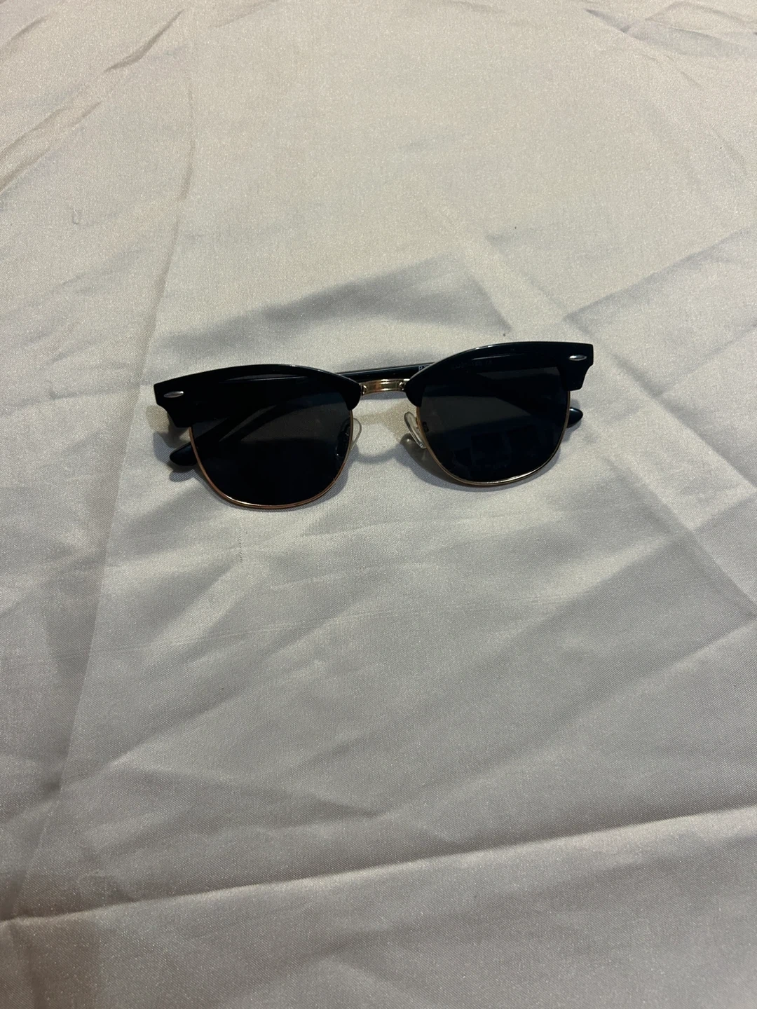 Selling a pair of sunglasses with a Clubmaster-inspired design. They feature a black and gold frame and dark lenses. Great for adding a touch of retro style to any outfit