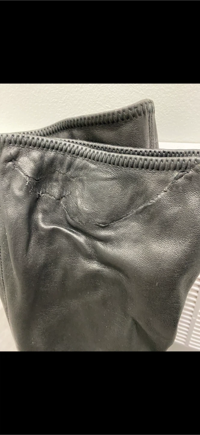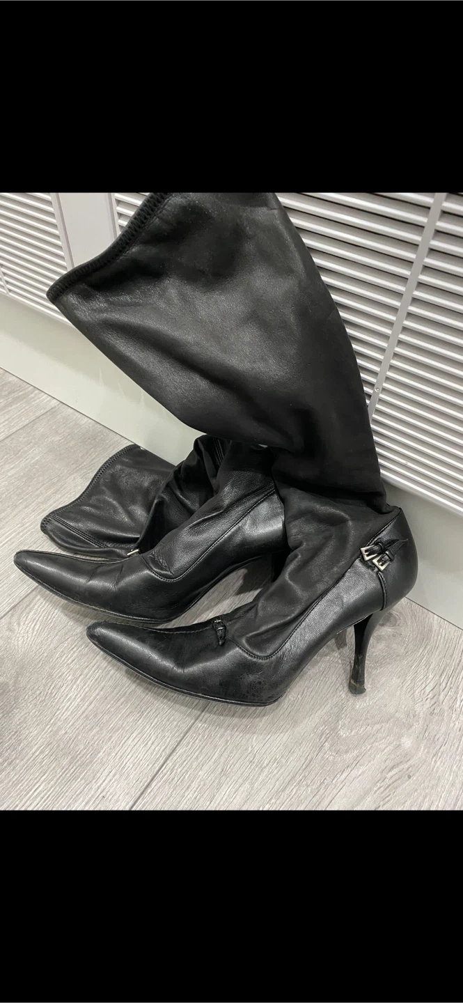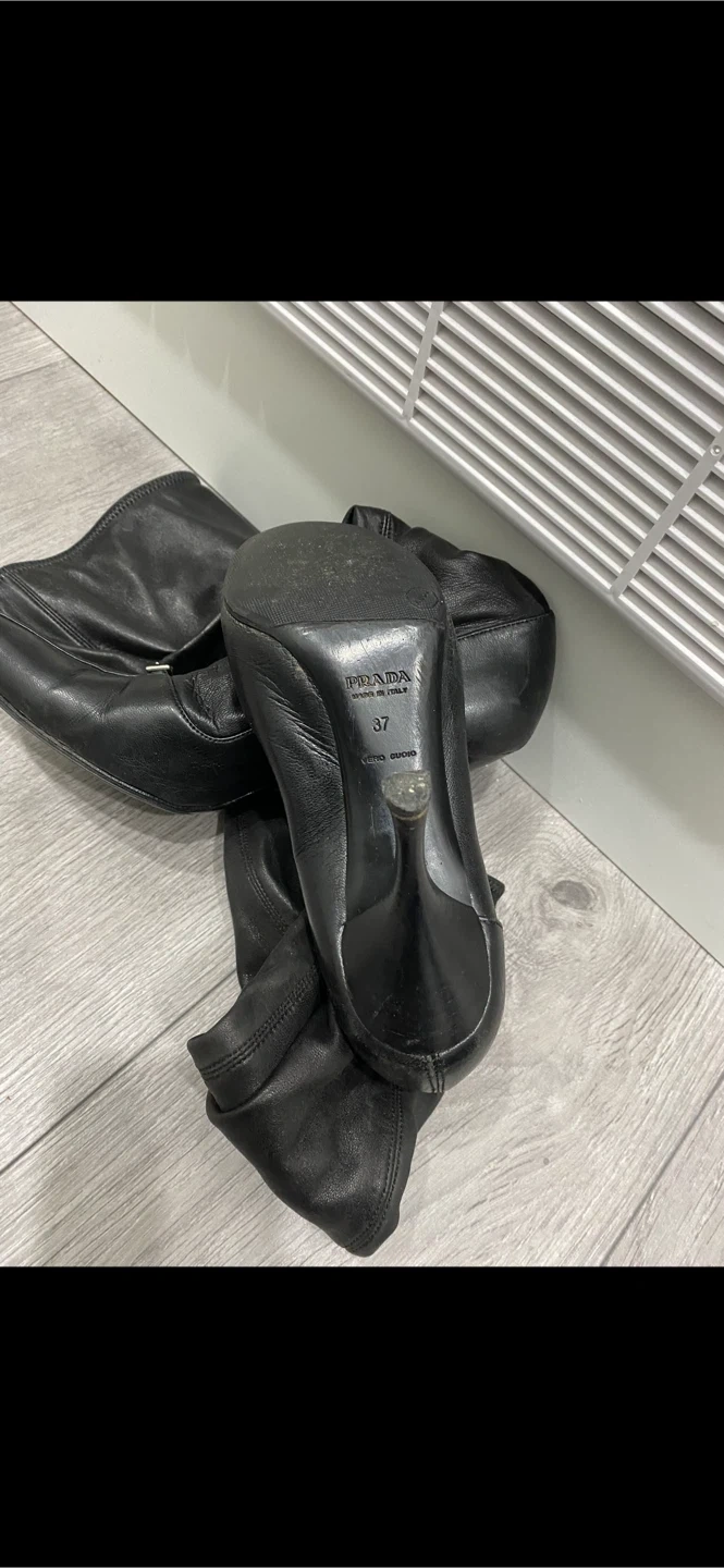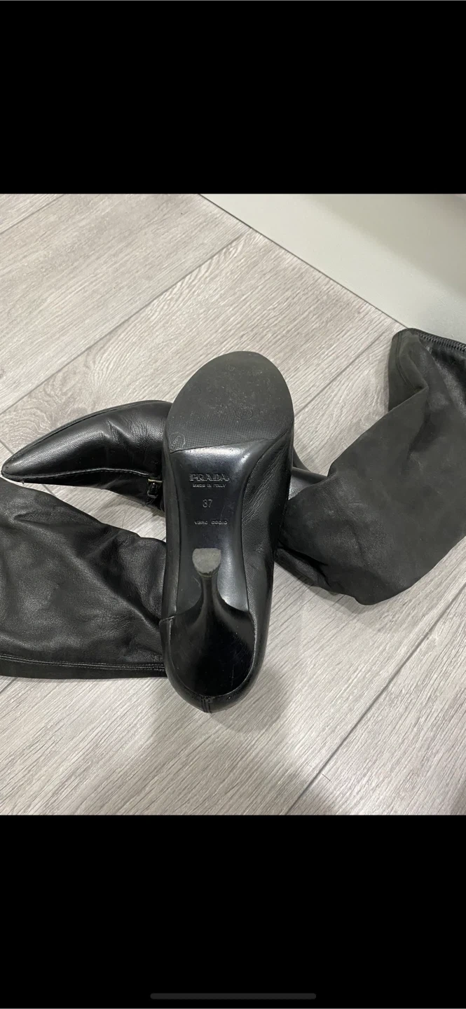 Selling a pair of stylish authentic Prada over-the-knee boots in black leather. They are in great condition and size 37. Perfect for adding a touch of elegance to any outfit! There’s a ripped on the top right side boot which has been fixed by the cobbler.