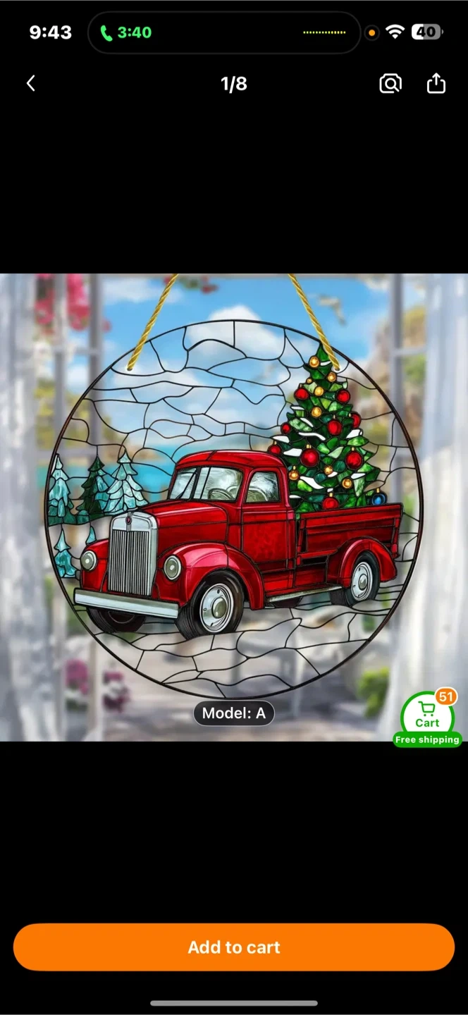3972D Christmas acrylic sun catcher Red truck Stained glass like Window hanging decor 8" x 8" New