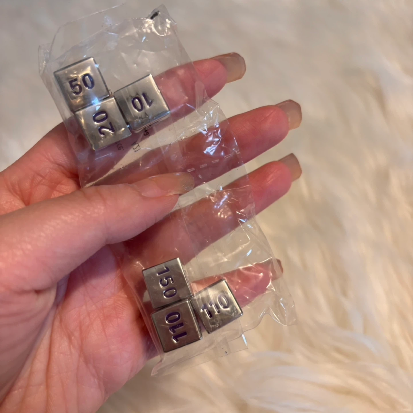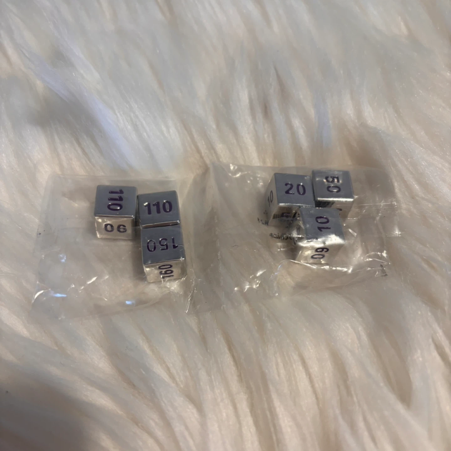 This is a set of six metal dice, each engraved with numbers. The numbers visible are 06, 10, 20, 50, 90, 110, and 150. These dice would be useful for various tabletop games or as unique decorative pieces.