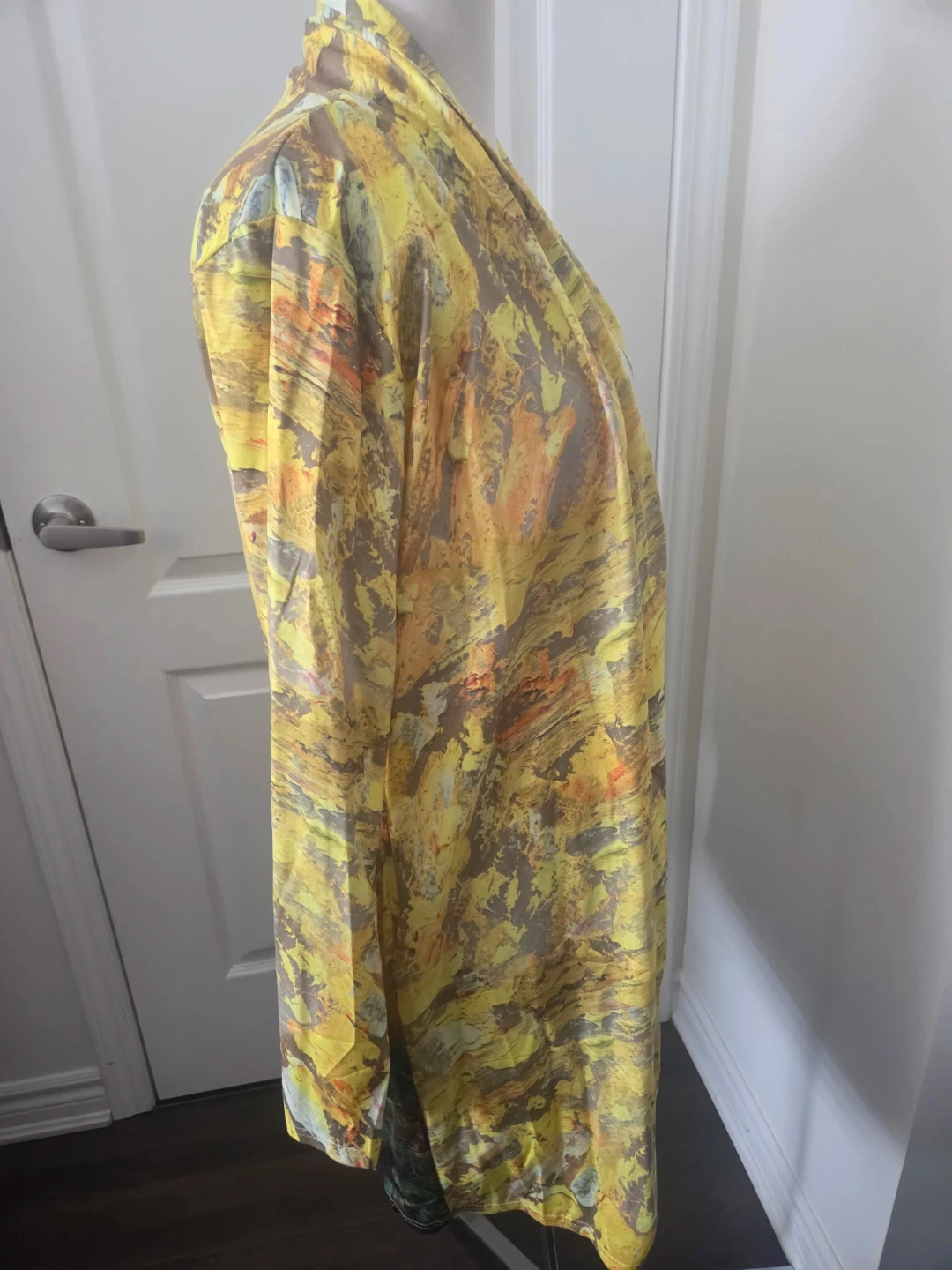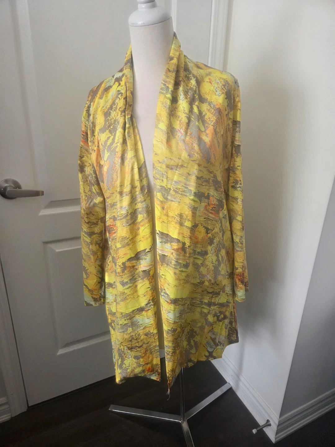 This women's cardigan features a vibrant abstract yellow and orange floral print. It's a long-sleeved, open-front style. A unique piece that adds a pop of colour to any outfit!