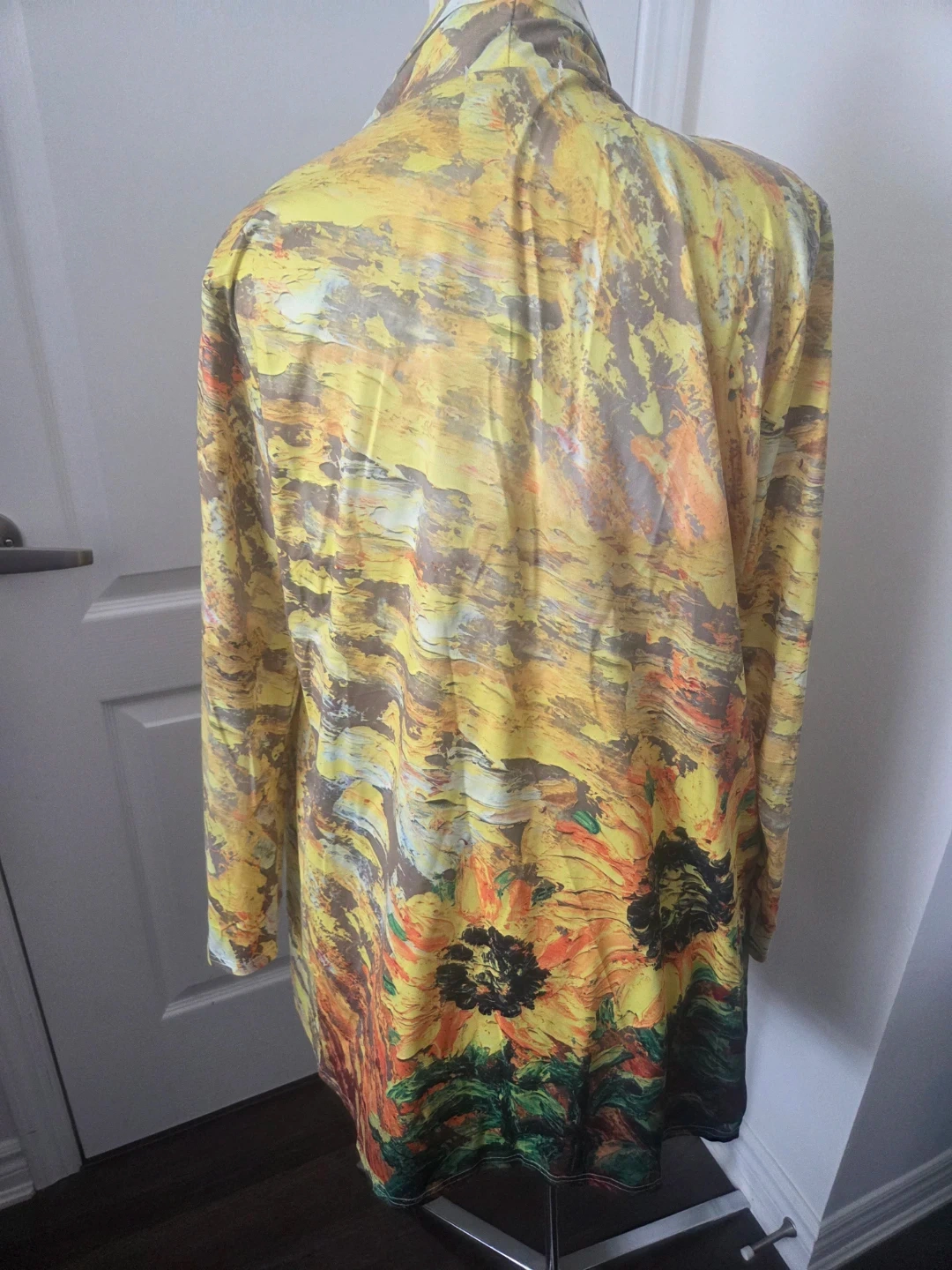 This women's cardigan features a vibrant abstract yellow and orange floral print. It's a long-sleeved, open-front style. A unique piece that adds a pop of colour to any outfit!