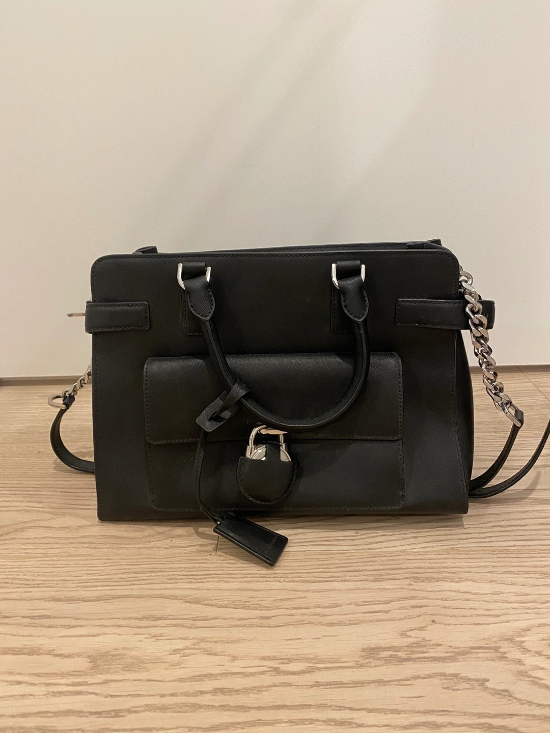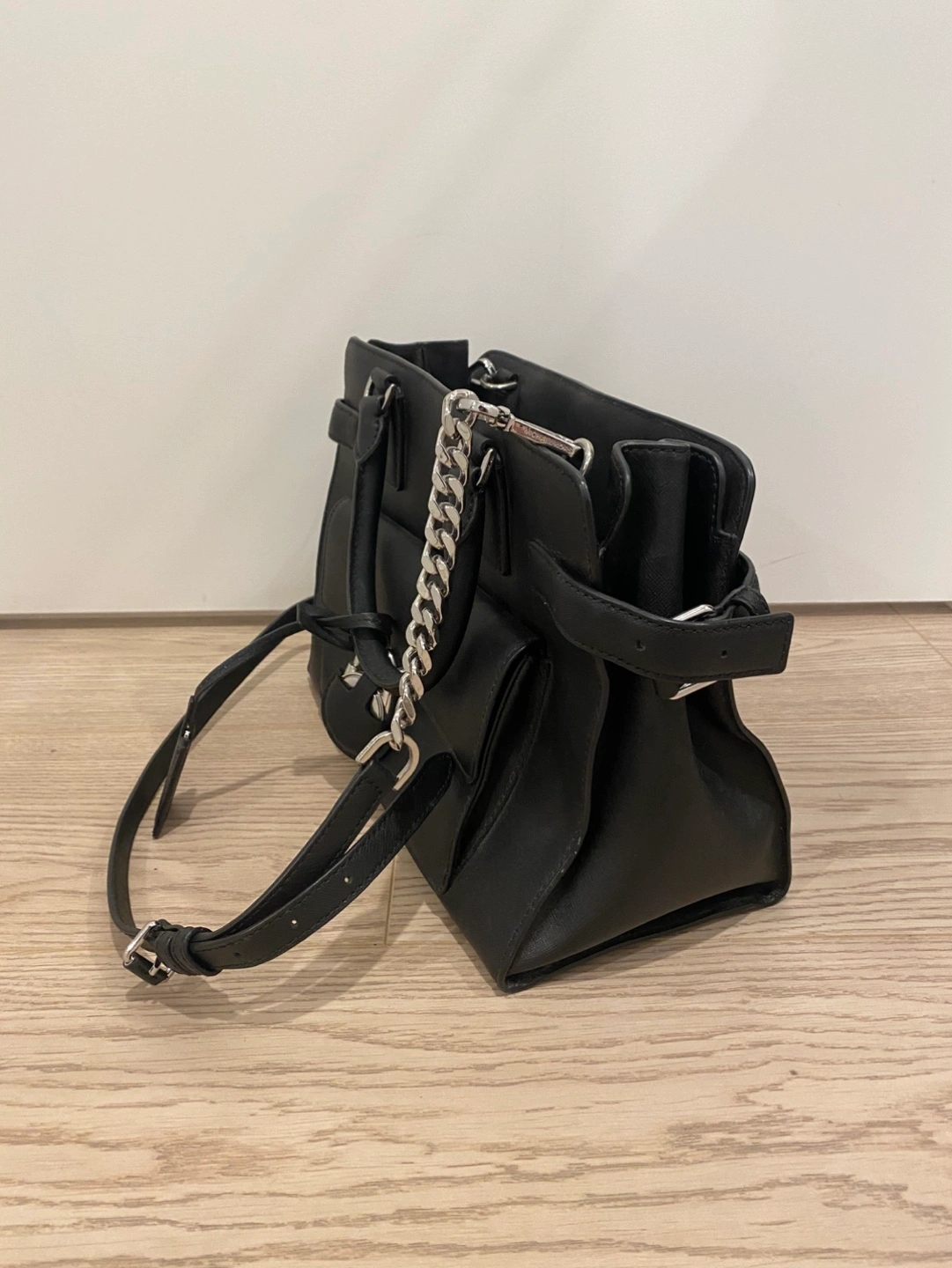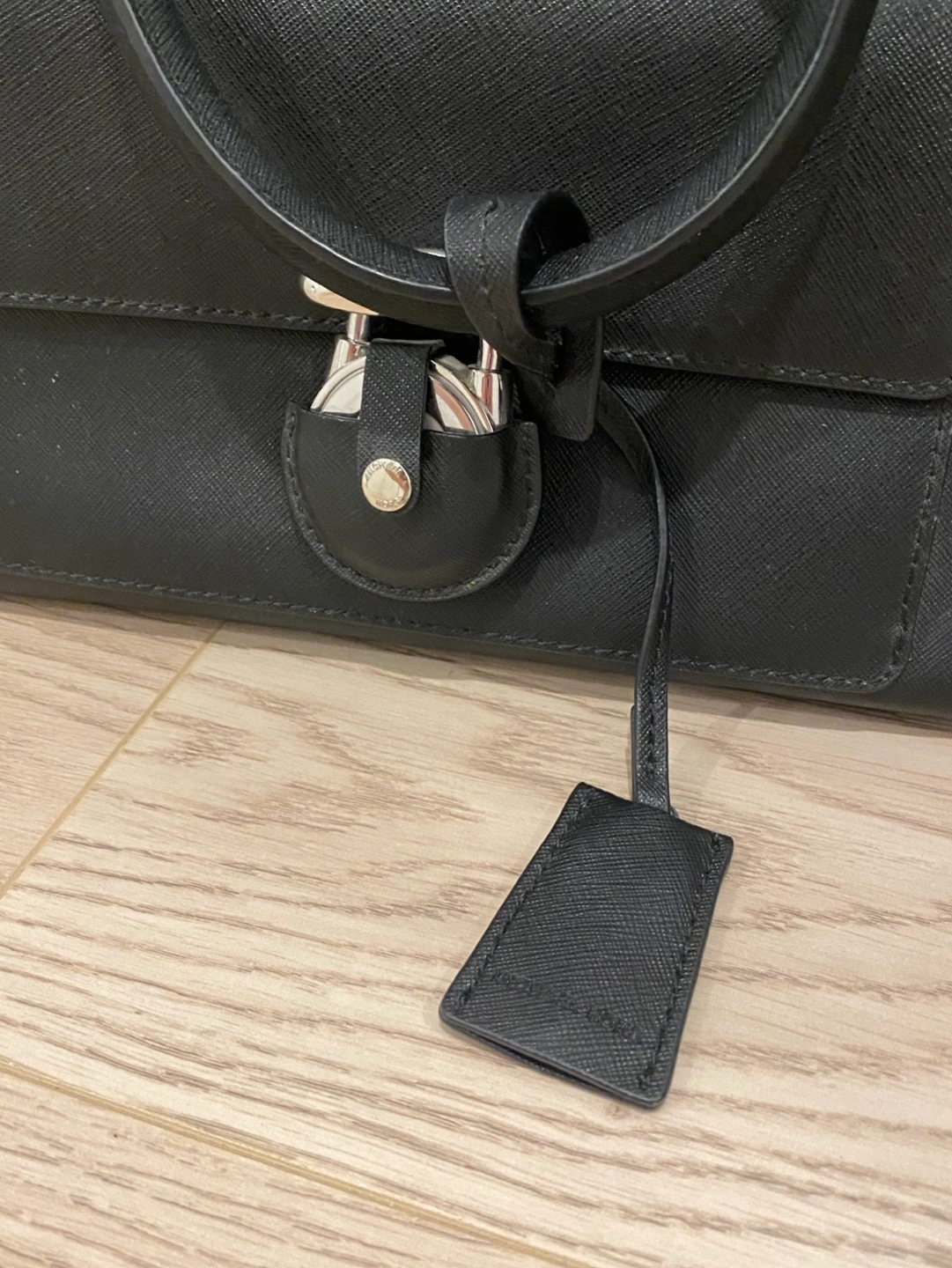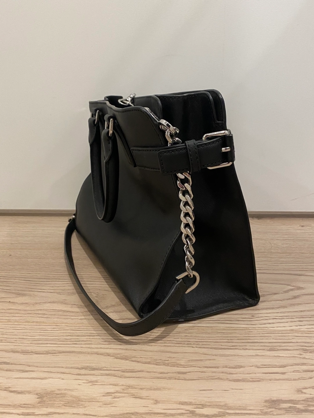 Black leather satchel handbag. Features a top handle, detachable shoulder strap, and silver-toned hardware, a lock and a hidden key.