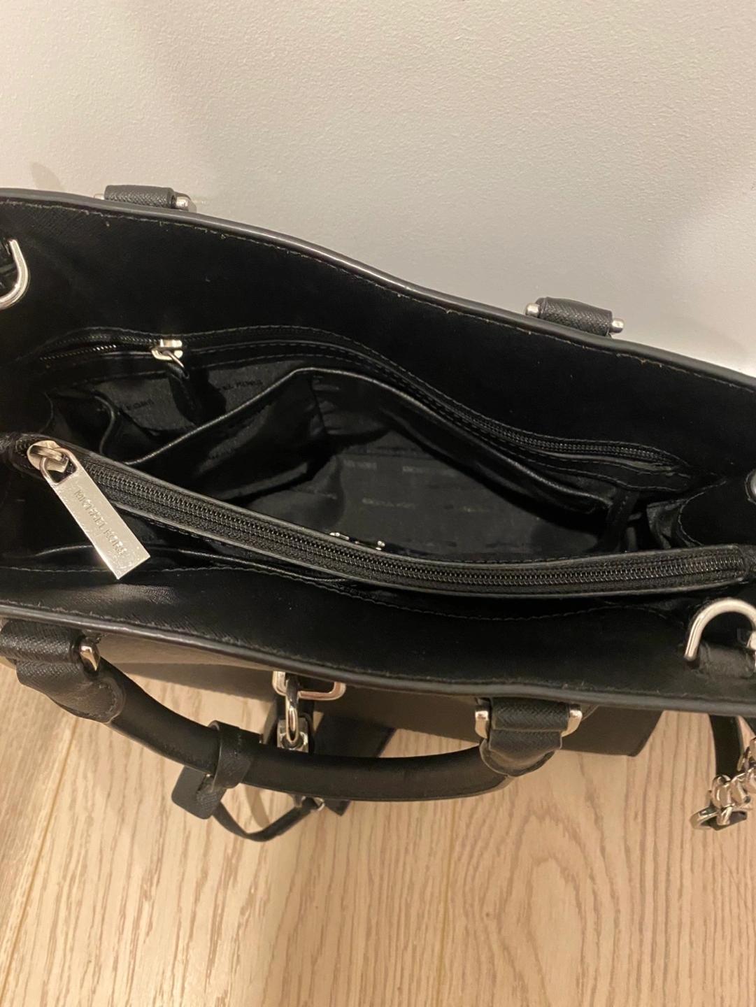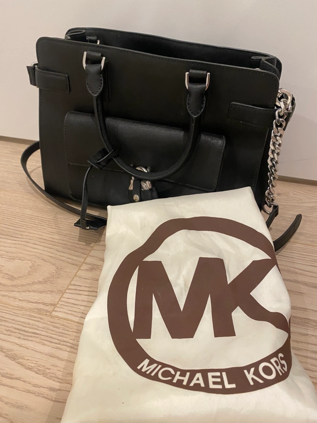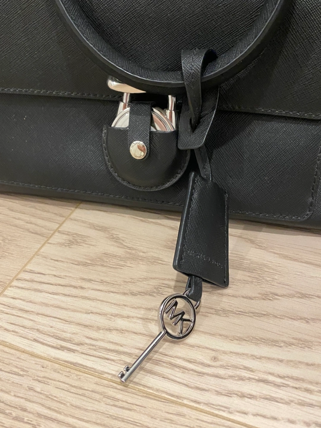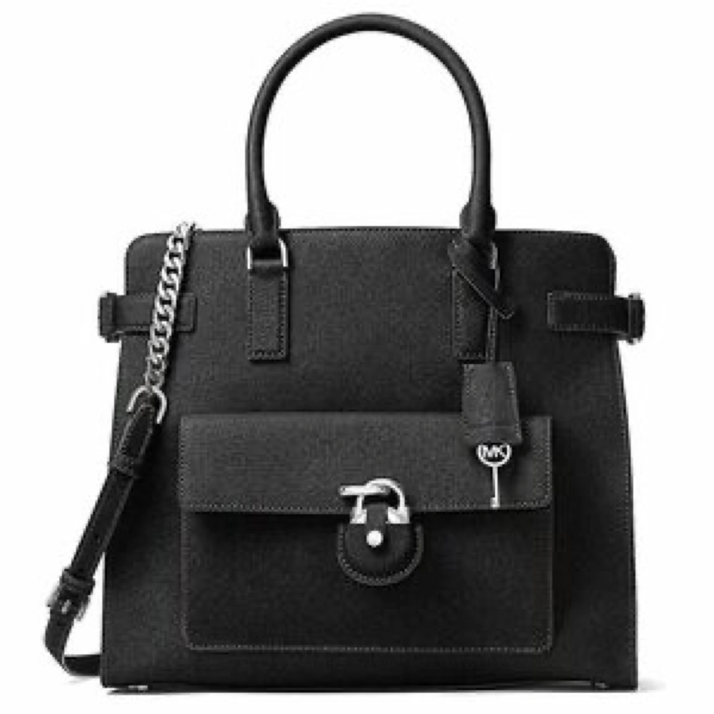 Black leather satchel handbag. Features a top handle, detachable shoulder strap, and silver-toned hardware, a lock and a hidden key.