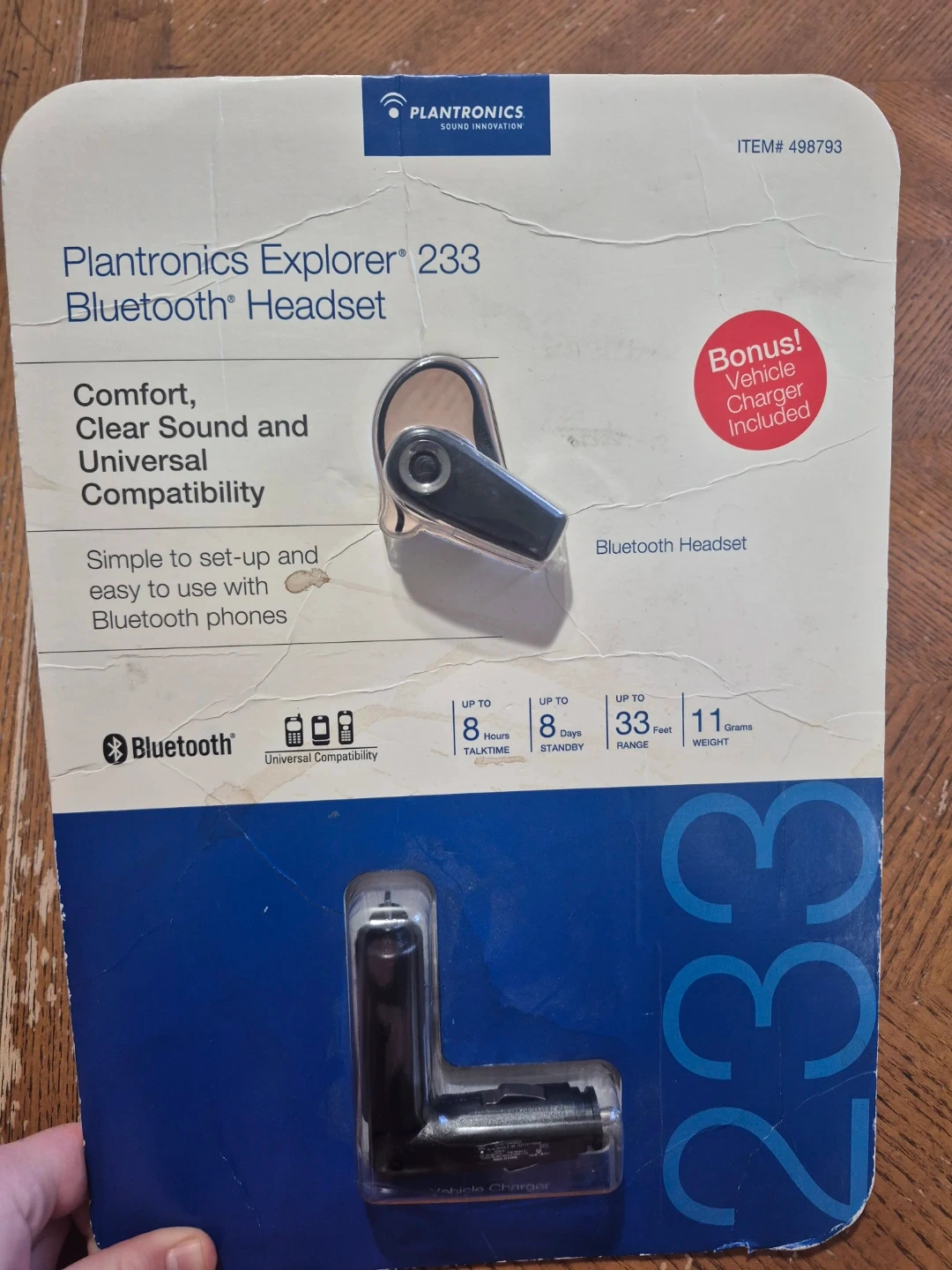 Selling a brand new Plantronics Explorer 233 Bluetooth Headset! It offers comfort, clear sound and universal compatibility. It's simple to set up and easy to use with Bluetooth phones. It has up to 8 hours talktime, up to 8 days standby time, and up to 33 feet range. Bonus vehicle charger included!