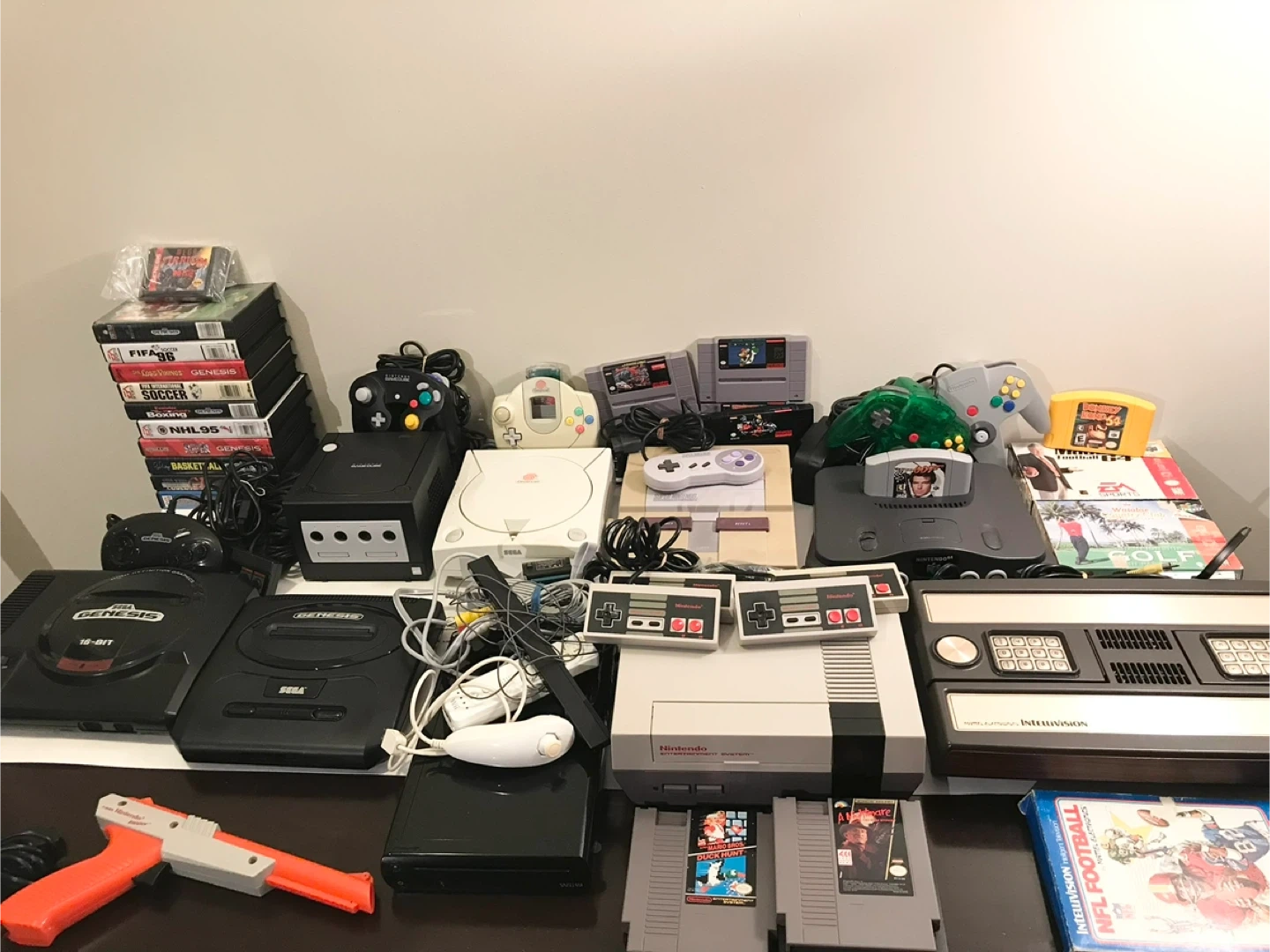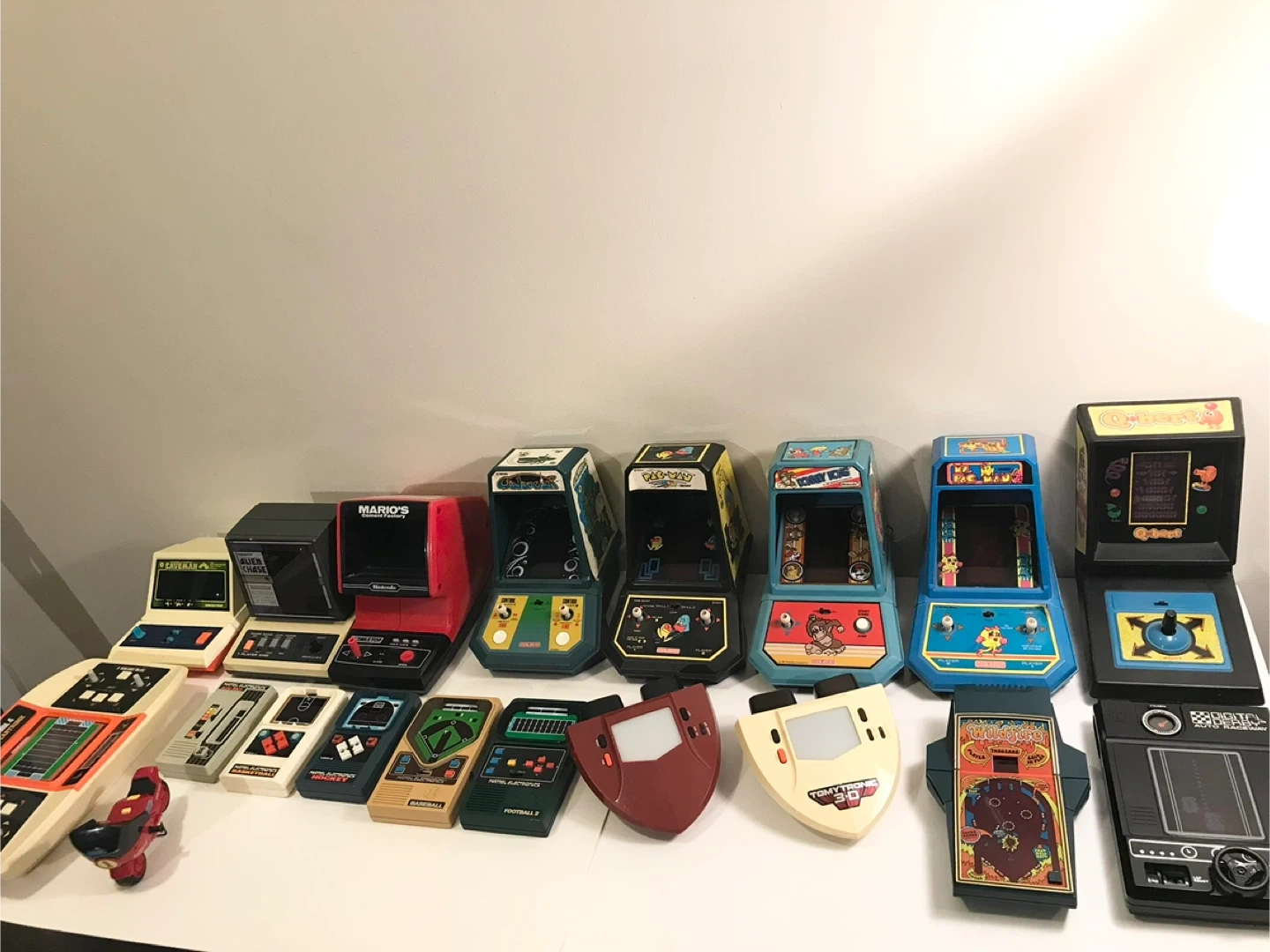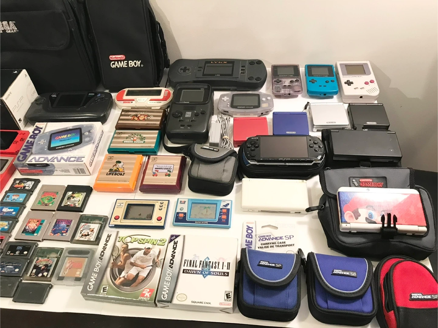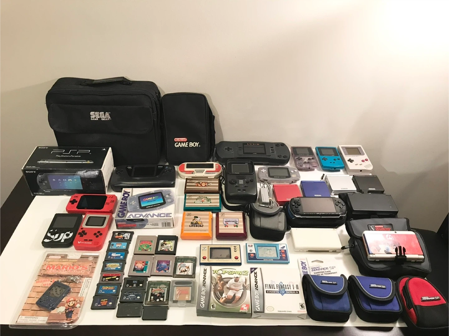 Collection of various retro handheld gaming devices including Nintendo Game Boy, Game Boy Advance, PSP, and Sega Game Gear. Also includes several mini arcade games and accessories. Great for collectors or anyone looking for nostalgic gaming.selling as a lot . 10$ and up .