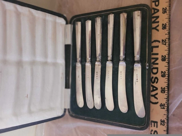 For sell is this ANTIQUE 6 Butter Knife Set original Cas in good condition but use a cleaning asking $50 pick up on beaverbrook lane Kanata thank you The image displays a cased set of six antique or vintage butter kn