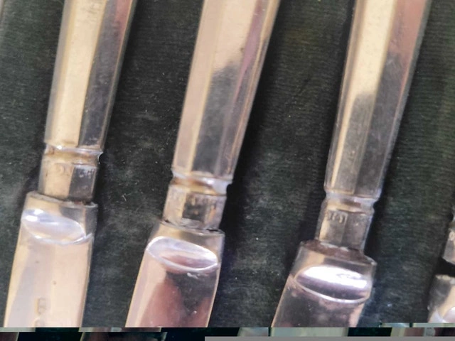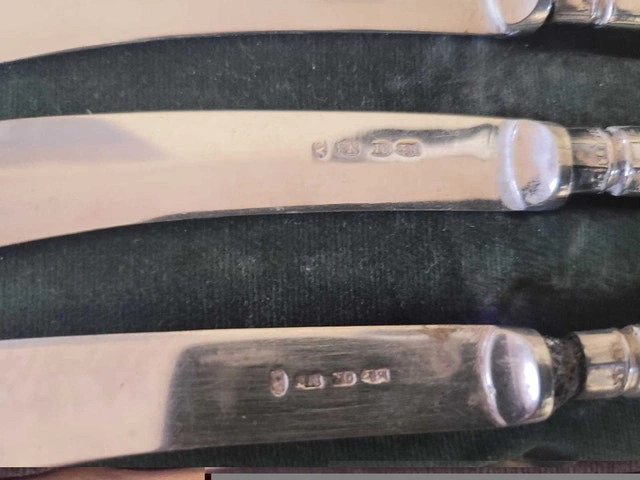 For sell is this ANTIQUE 6 Butter Knife Set original Cas in good condition but use a cleaning asking $50 pick up on beaverbrook lane Kanata thank you The image displays a cased set of six antique or vintage butter kn