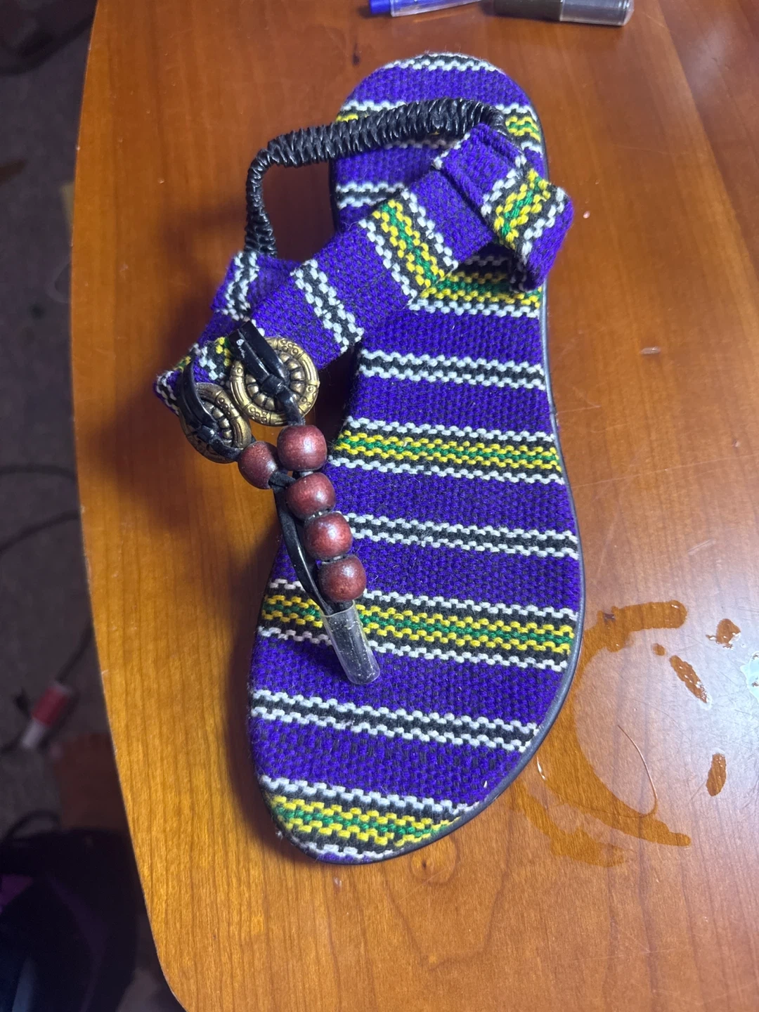 These are handmade purple sandals with a unique design. They feature a woven strap and beaded details. Perfect for adding a pop of colour to your outfit!