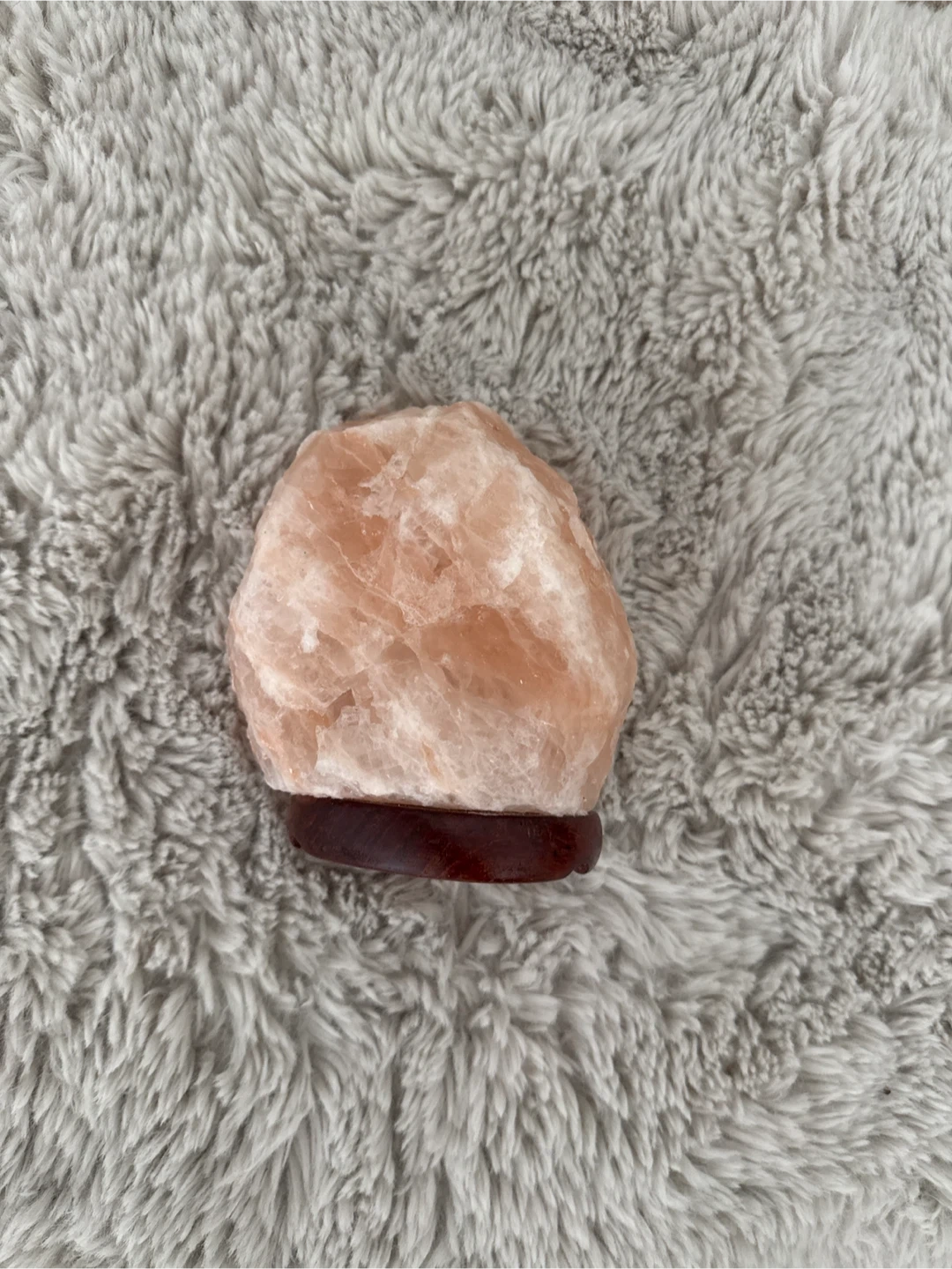This is a natural Himalayan salt lamp with a wooden base. It provides a soft, warm glow. It's a lovely decorative piece for any room.