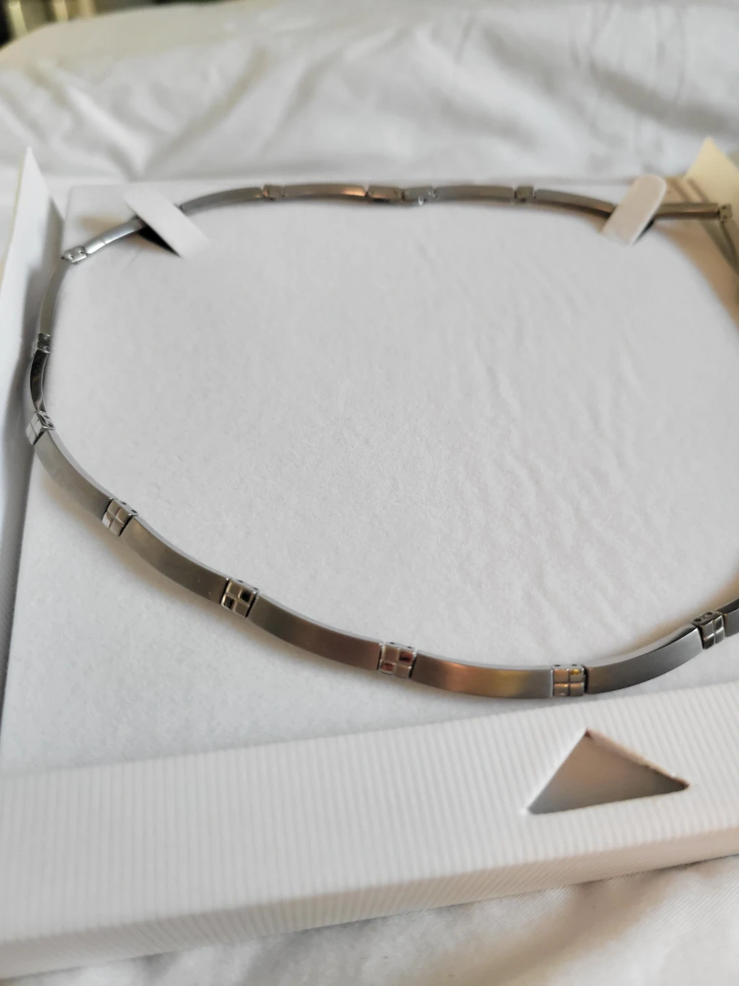 Elegant titanium tone necklace from Germany. It features a sleek chain with subtle square details. Comes in its original box.