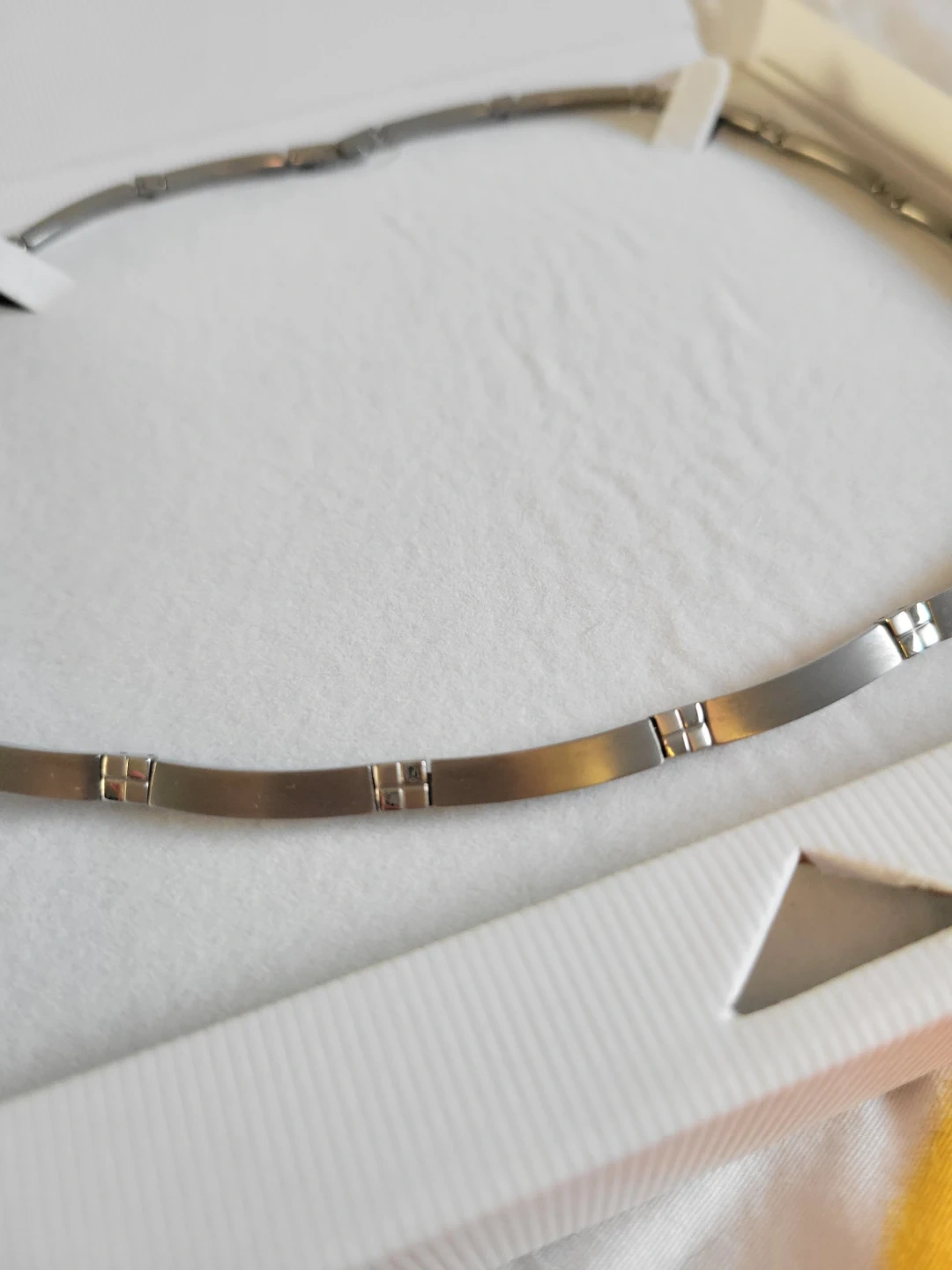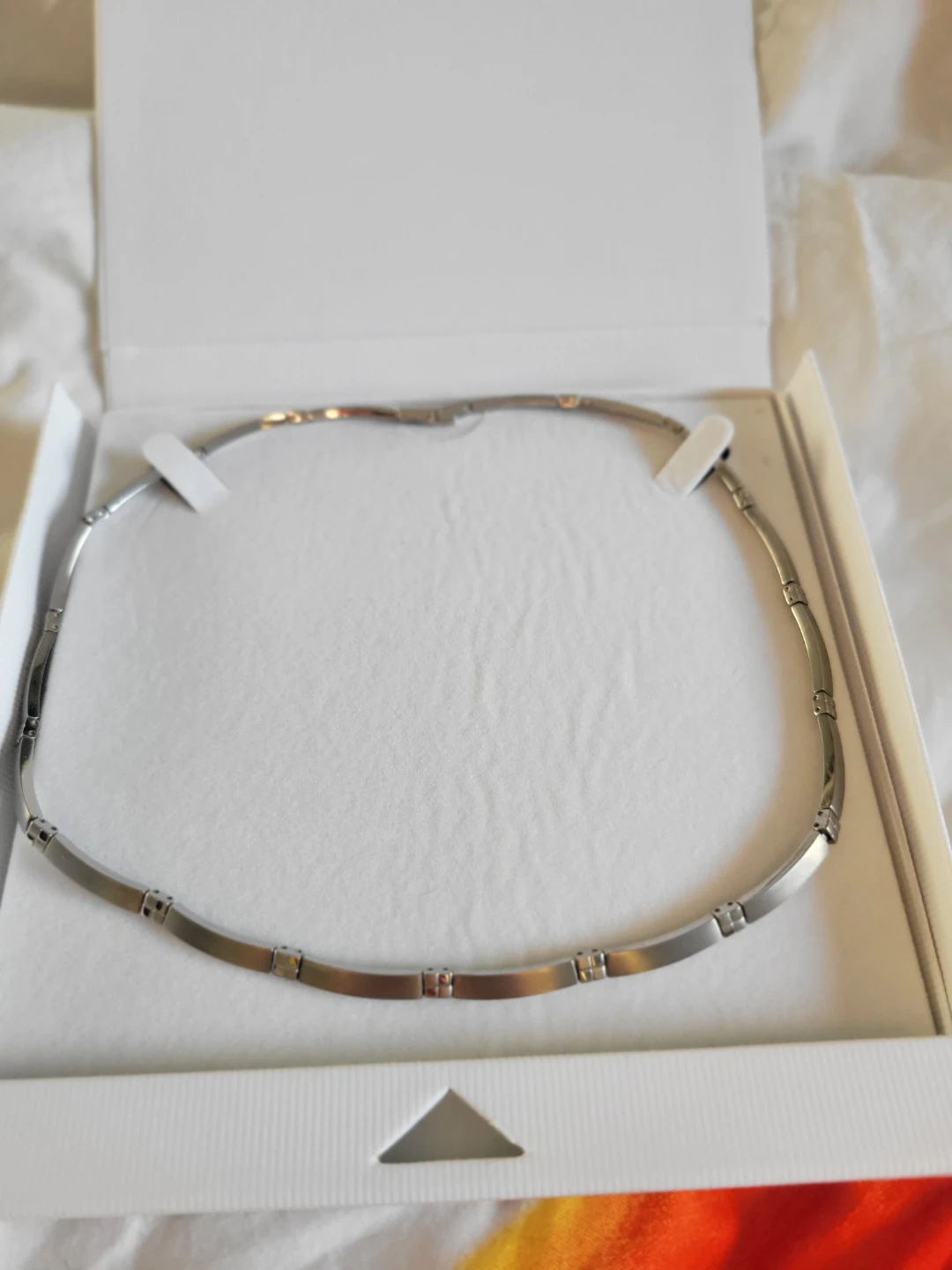 Elegant titanium tone necklace from Germany. It features a sleek chain with subtle square details. Comes in its original box.