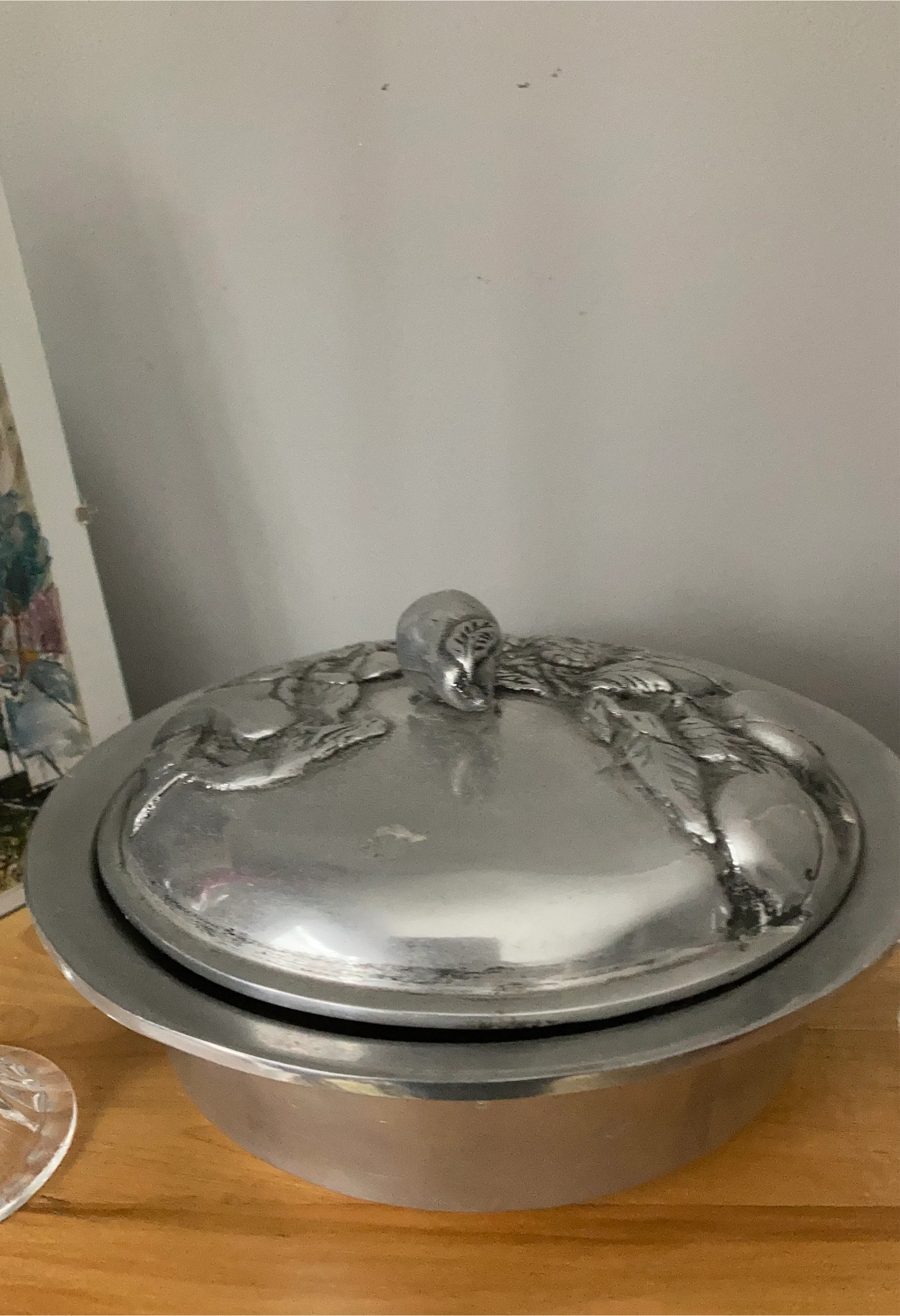This is a metal tureen with an embossed lid featuring a detailed design. It's a substantial piece that could be used for serving. The material appears to be pewter or a similar metal alloy.