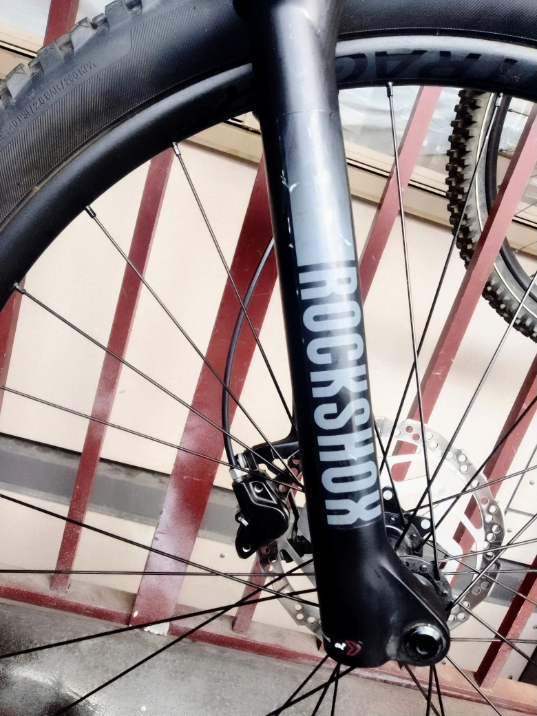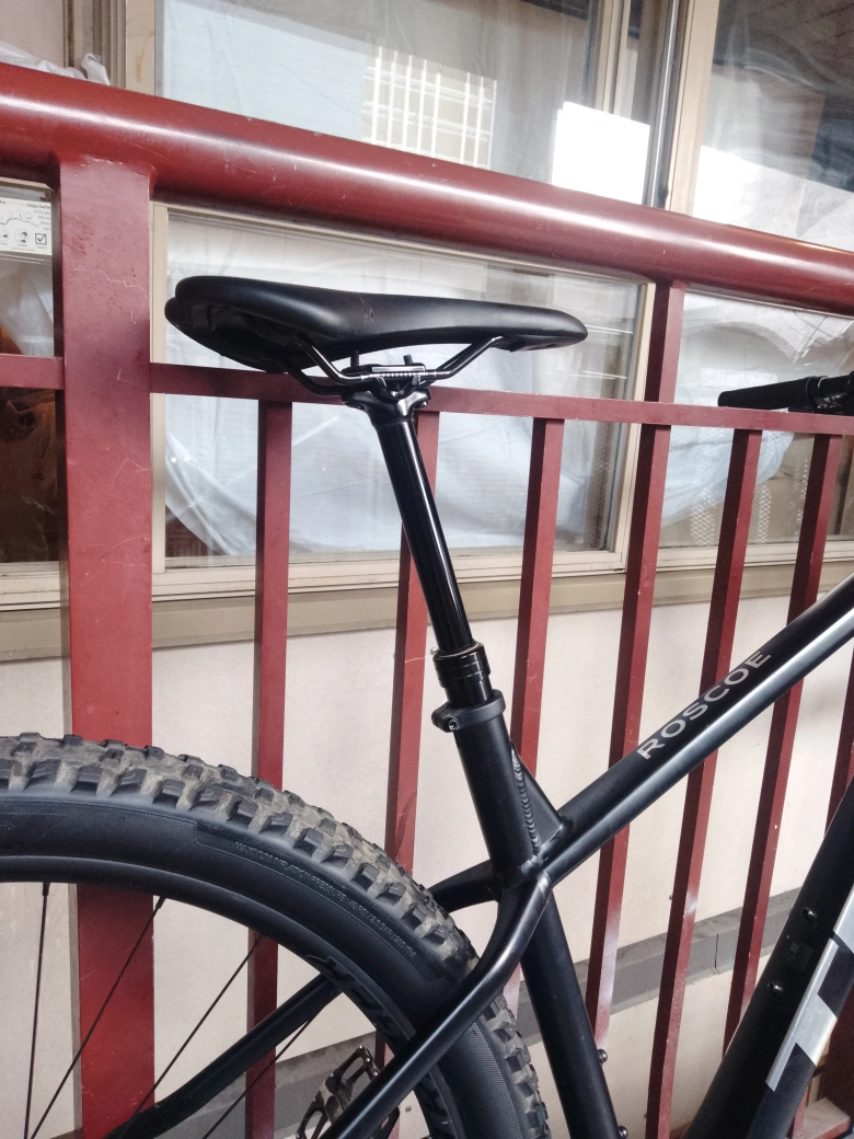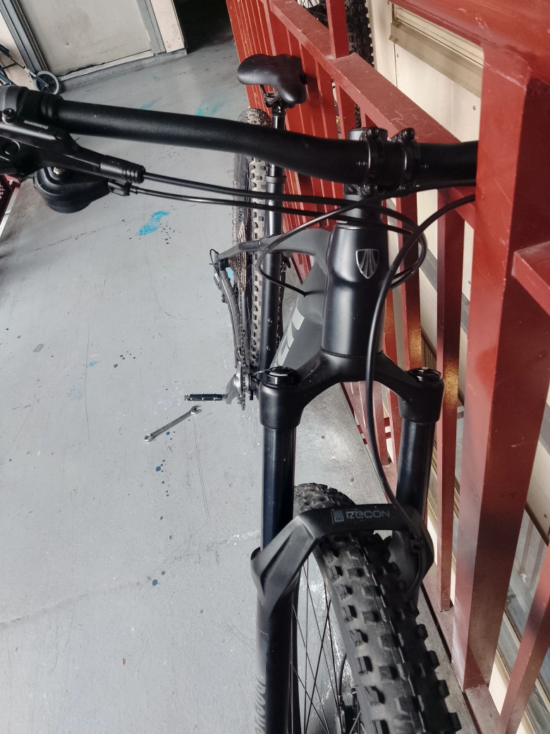A wicked 2025 Trek Roscoe mountain bike, with large tires, a comfortable hydrolic seat, and a sleek flat black frame with metallic accents. It's hardly been ridden, but I'm moving and need to sell it ASAP 😢.