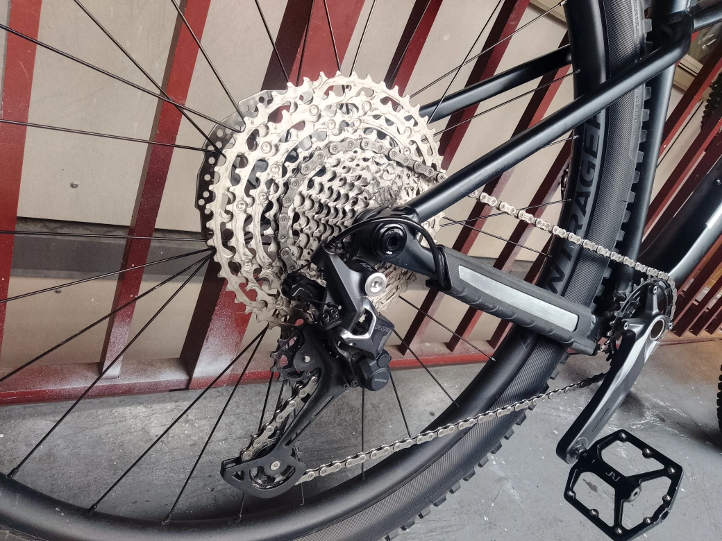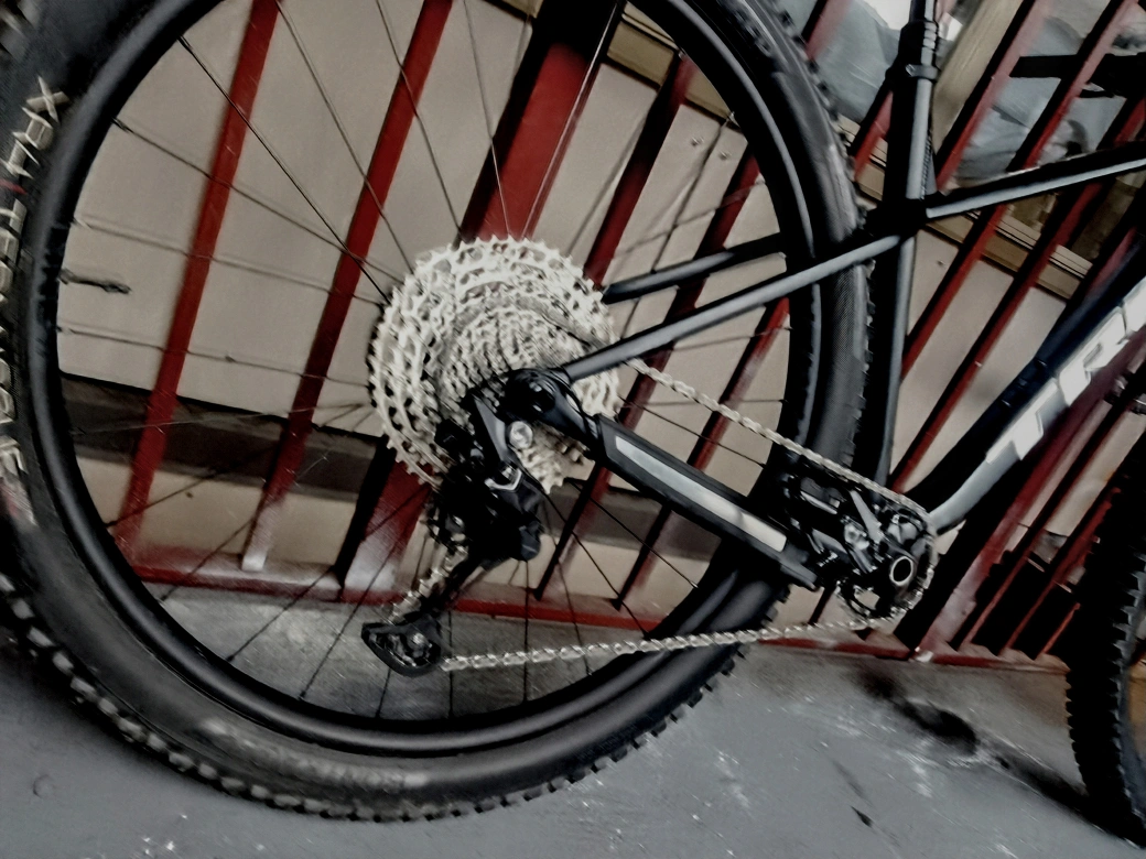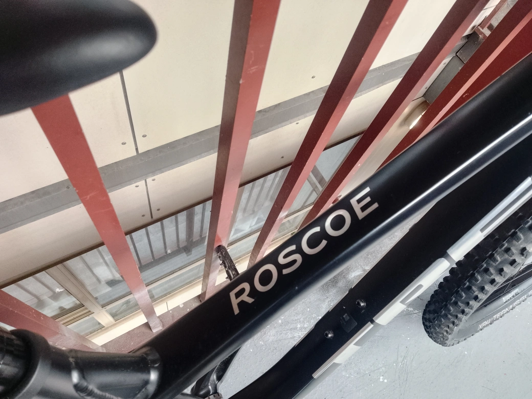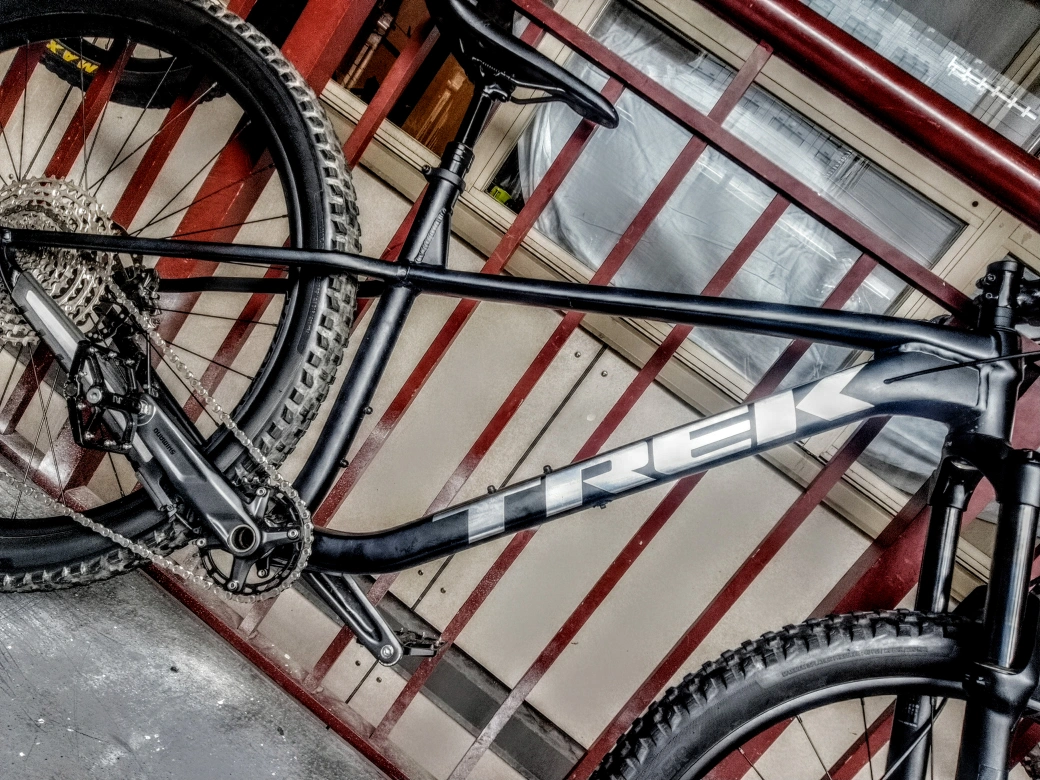 A wicked 2025 Trek Roscoe mountain bike, with large tires, a comfortable hydrolic seat, and a sleek flat black frame with metallic accents. It's hardly been ridden, but I'm moving and need to sell it ASAP 😢.