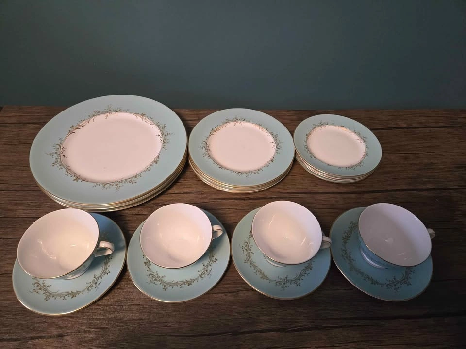 Beautiful Royal Doulton Melrose dinnerware set. Includes 4 large dinner plates, 5 medium plates, and 5 small plates. Also has 4 teacups with matching saucers. Light blue and white with gold accents and a floral scroll pattern. English fine bone china.