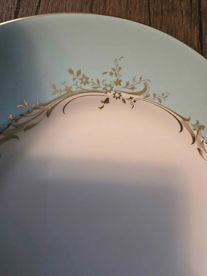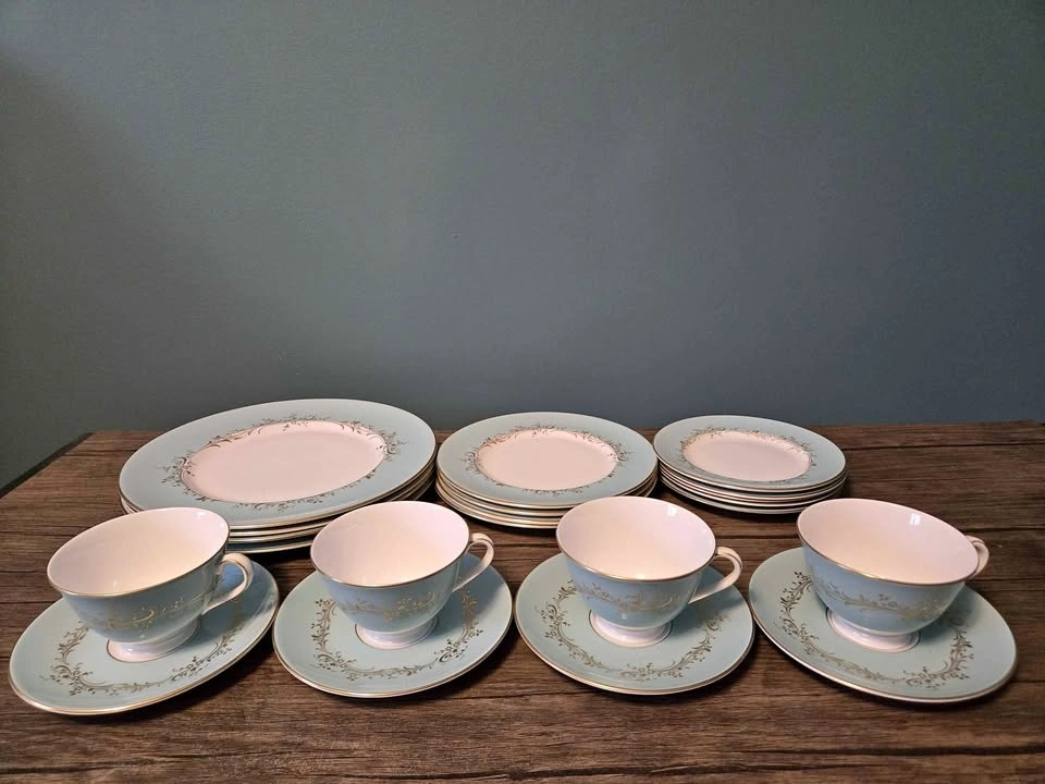 Beautiful Royal Doulton Melrose dinnerware set. Includes 4 large dinner plates, 5 medium plates, and 5 small plates. Also has 4 teacups with matching saucers. Light blue and white with gold accents and a floral scroll pattern. English fine bone china.