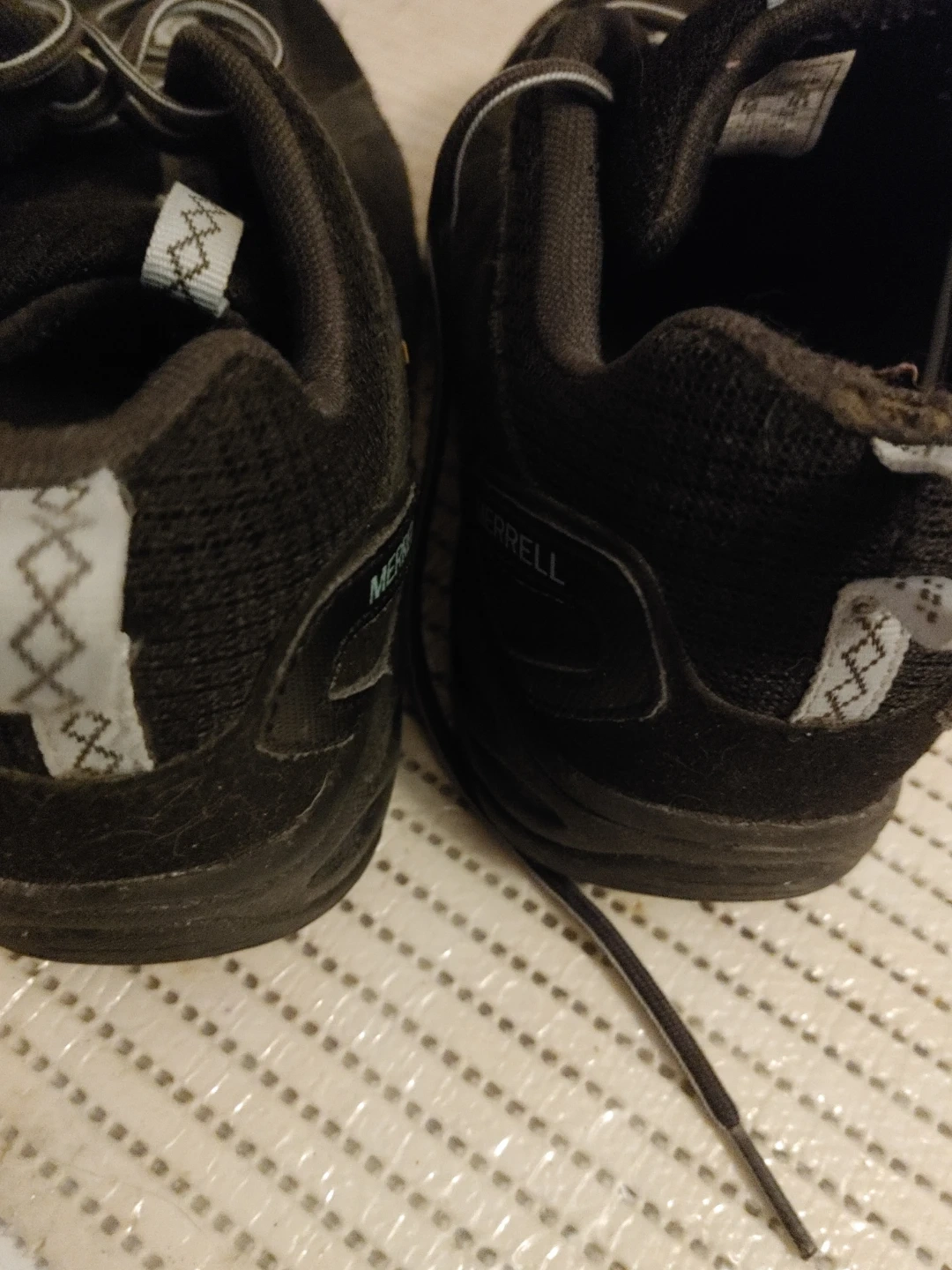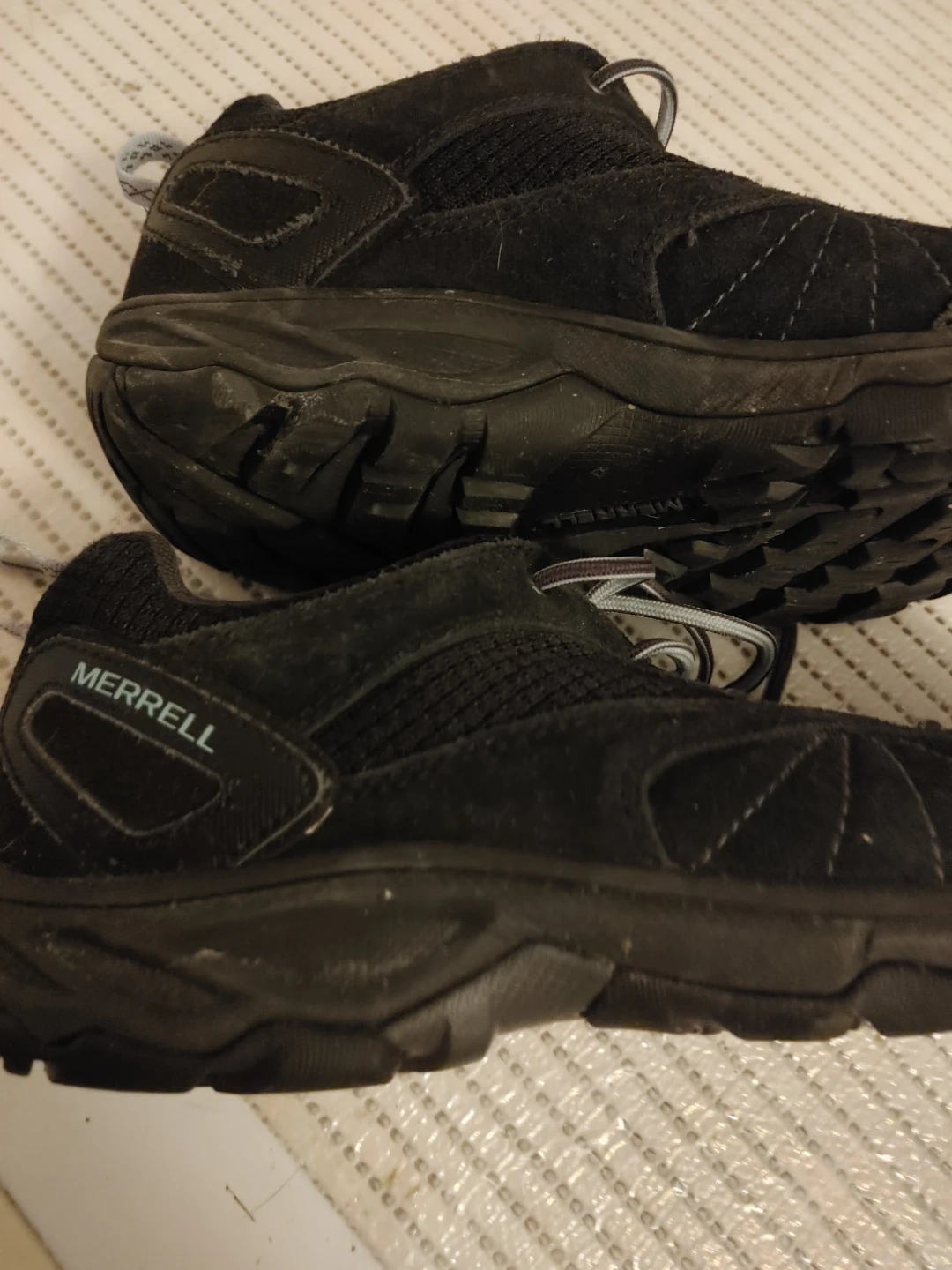 These Merrell shoes are black. They're designed for hiking. Suitable for trails and everyday wear.