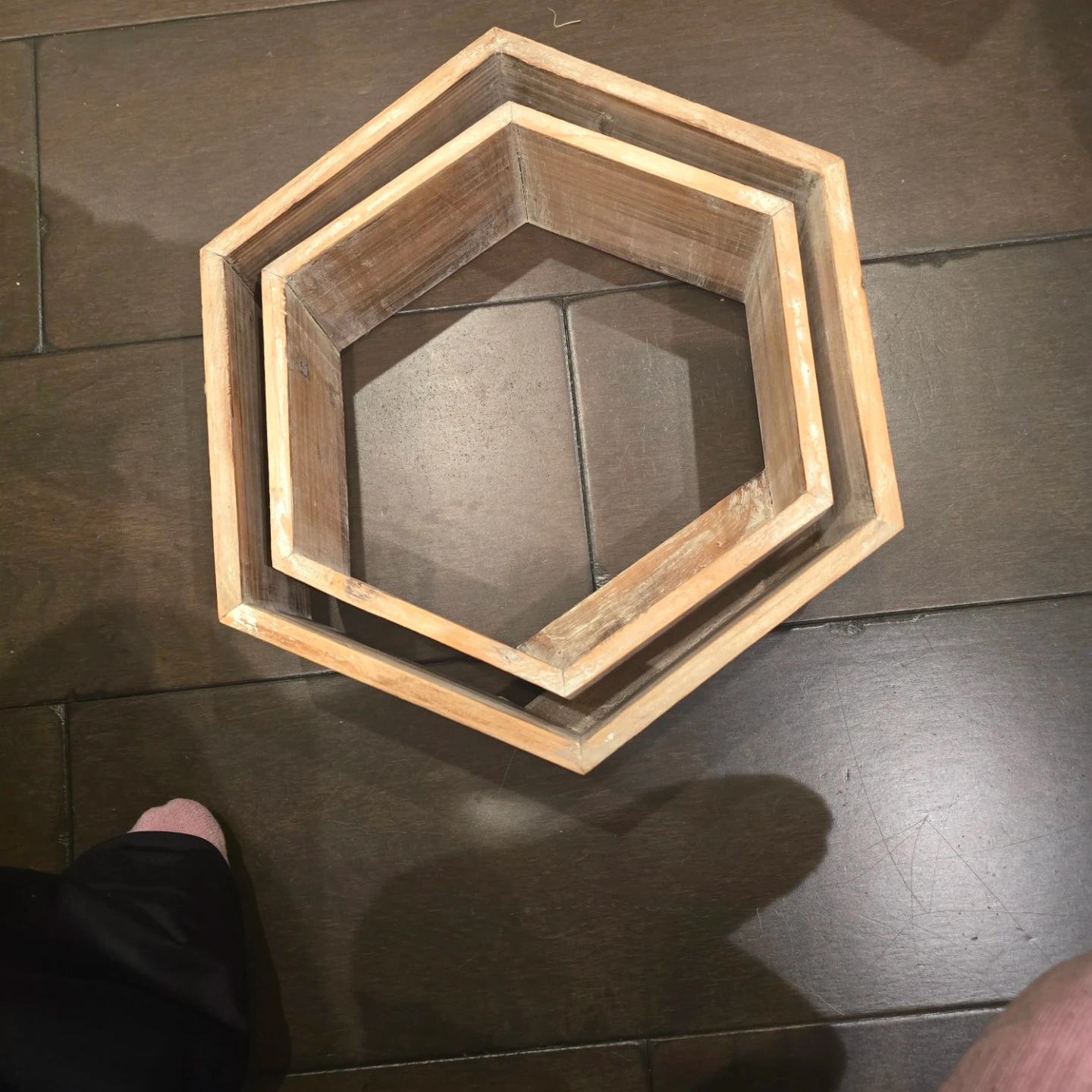 Display your items with this set of two wooden hexagon shelves. They're made from light-colored wood with a distressed finish. These shelves are great for organizing small items or displaying decorative pieces.