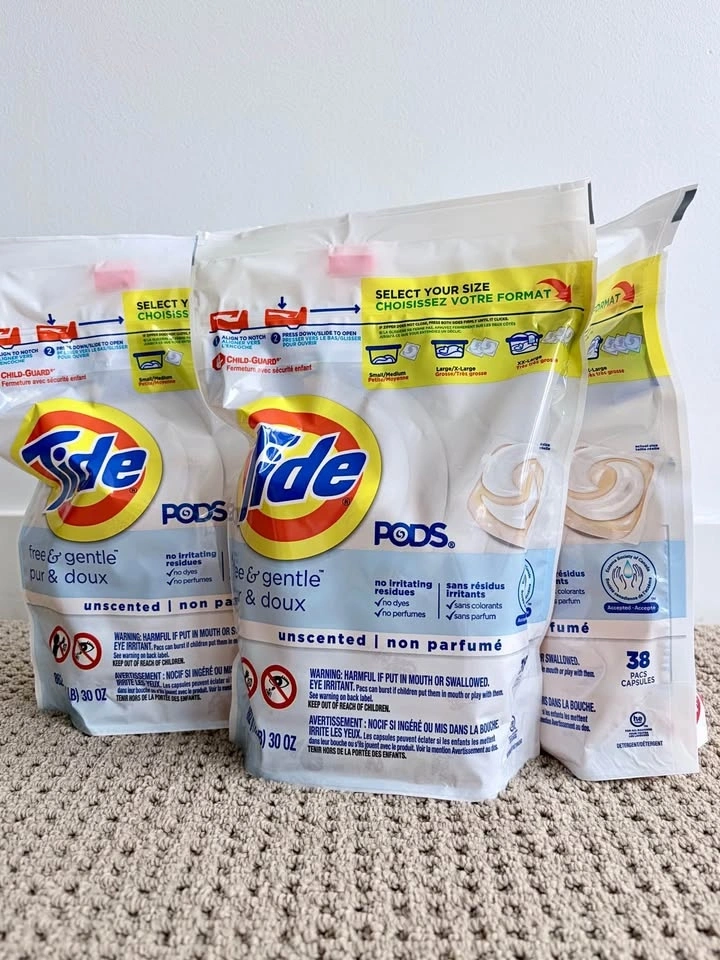 Moving sale! Selling my extra stock of original Tide Pods (Free & Gentle). This version is hypoallergenic and dye-free — perfect for sensitive skin. Condition: Brand new, unopened. Quantity: 2 packs available (38 pods each). Price: $13 per pack. My price is lower than retail + you get more capsules + you save on taxes.