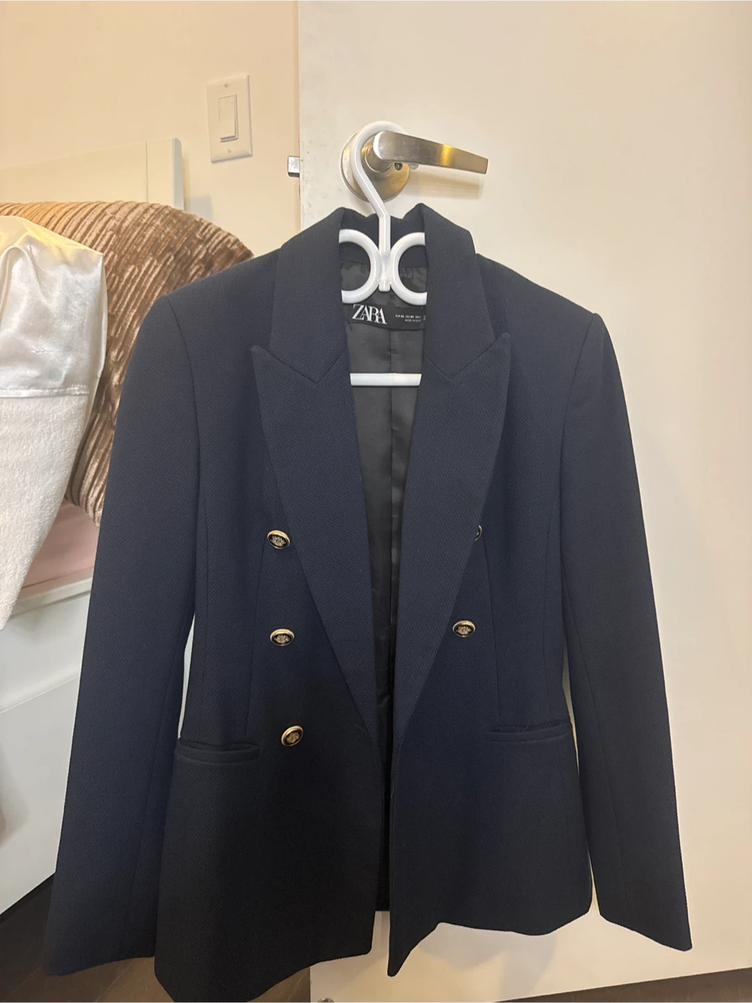 Selling a stylish navy blue blazer from Zara! It features a double-breasted design with gold-tone buttons, adding a touch of elegance. Perfect for dressing up or down. It is in great condition!
