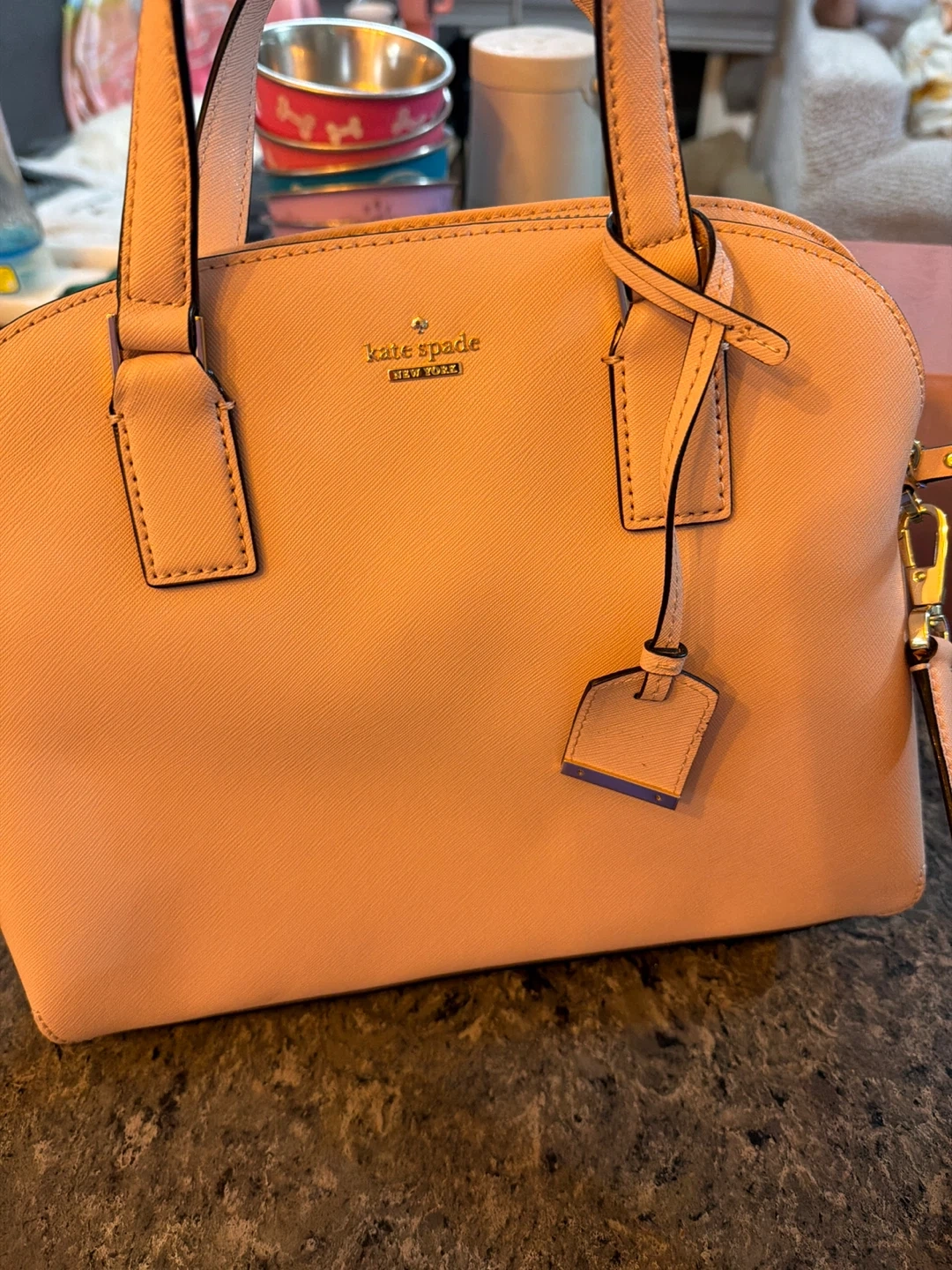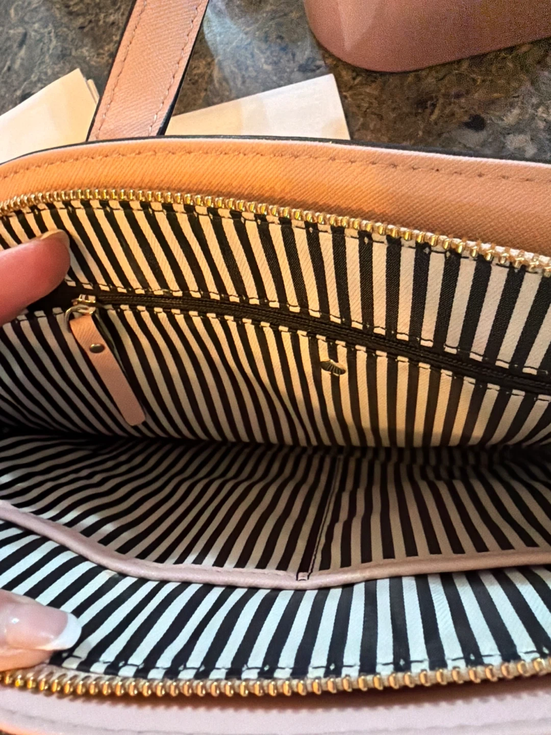 This is a Kate Spade dome satchel handbag in a lovely pink colour. It features a striped interior lining and a zip closure. The bag is made of leather.