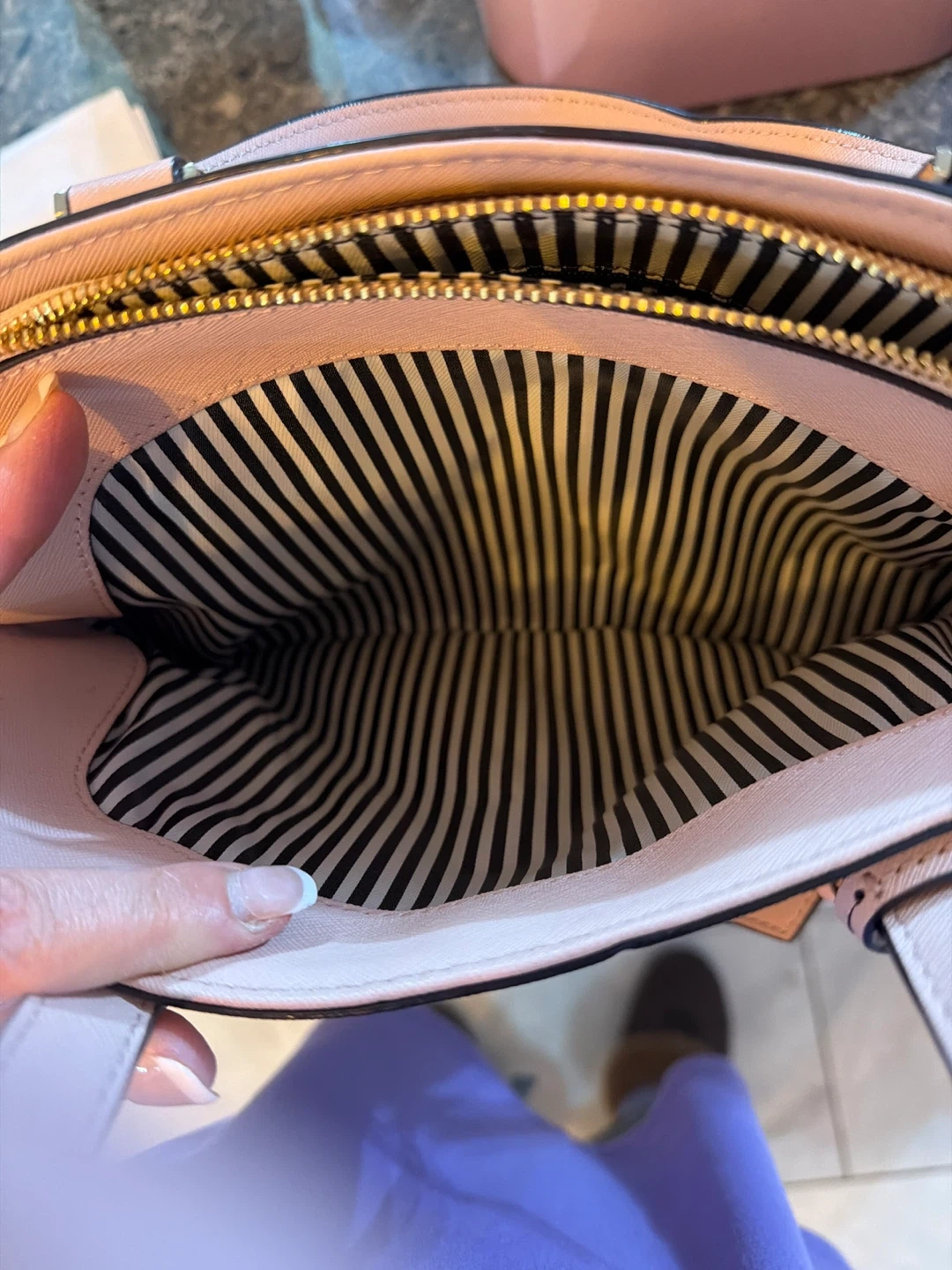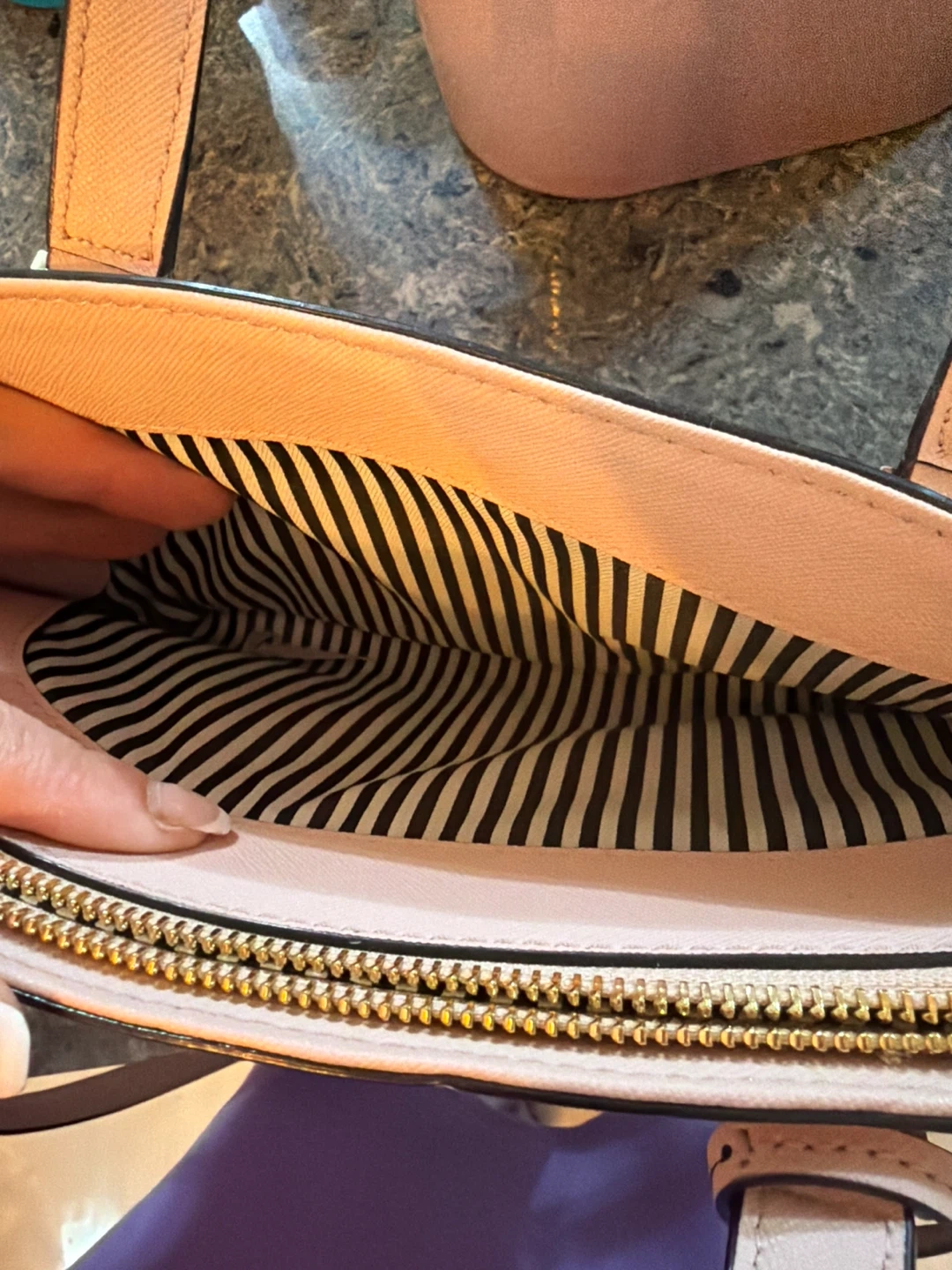 This is a Kate Spade dome satchel handbag in a lovely pink colour. It features a striped interior lining and a zip closure. The bag is made of leather.