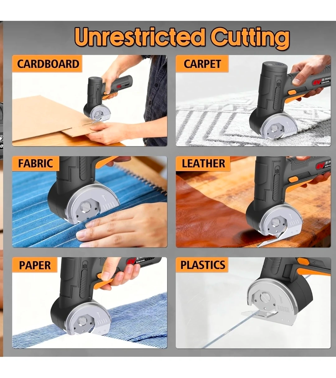 This cordless electric scissor features an enhanced motor with 320 RPM cutting speed. It has a safety lock for anti-misoperation and an LED light for clearer viewing. The oversized tungsten steel blade has a 1.84-inch jaw and can cut materials up to 1/3" thick, including cardboard, carpet, fabric, leather, paper, and plastics. Easy one-step disassembly and magnetic accessory storage make it convenient to use.