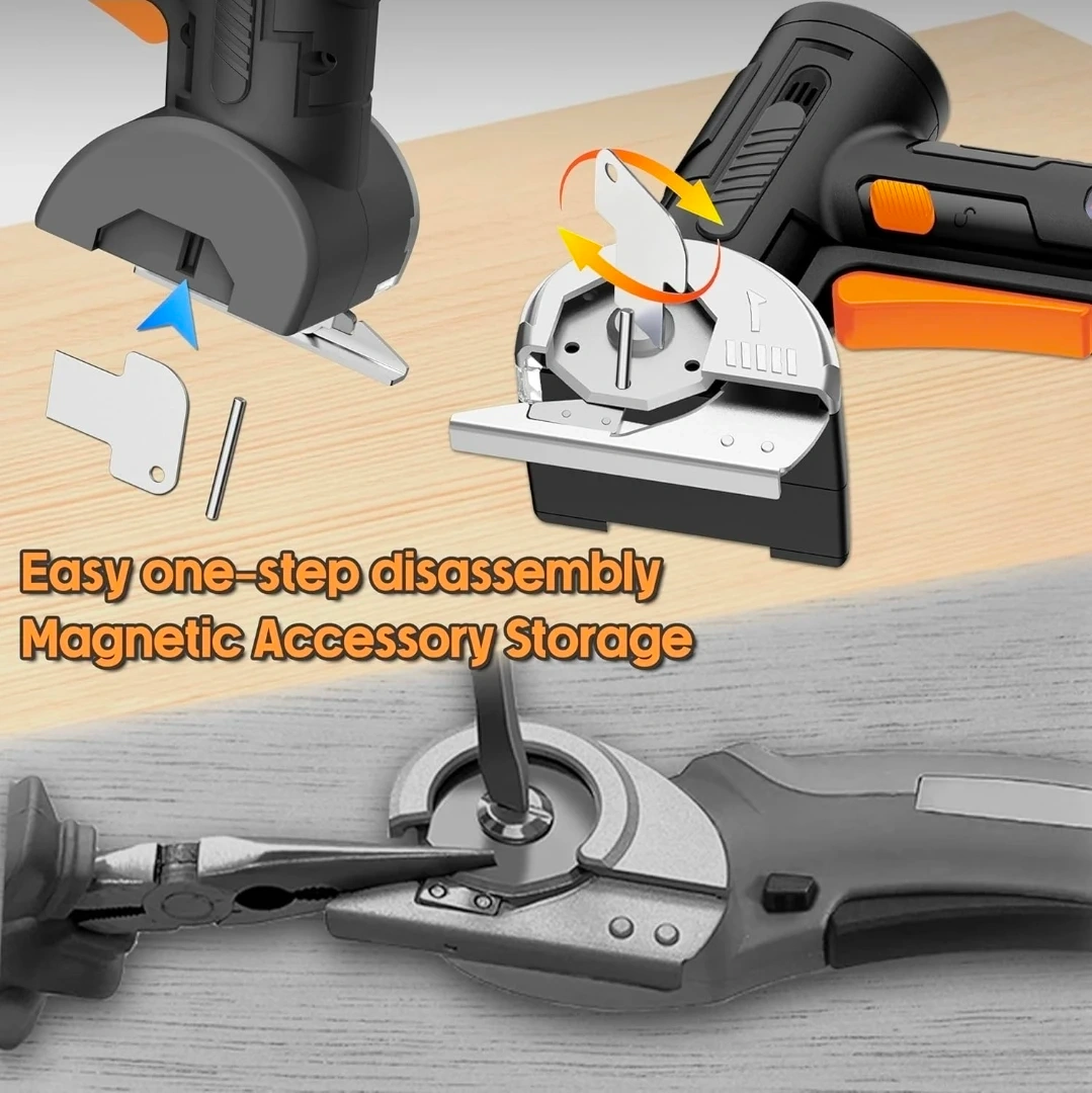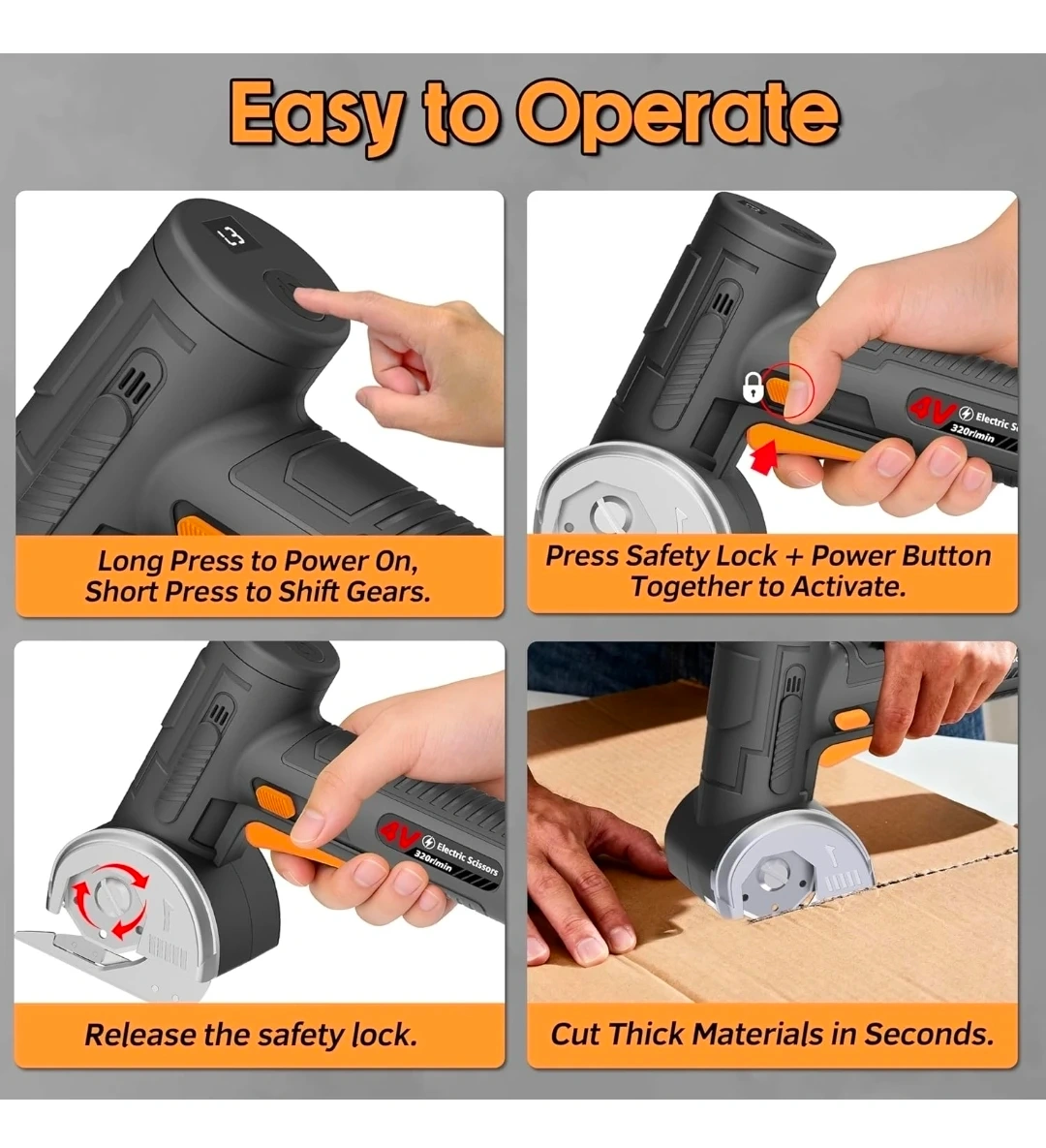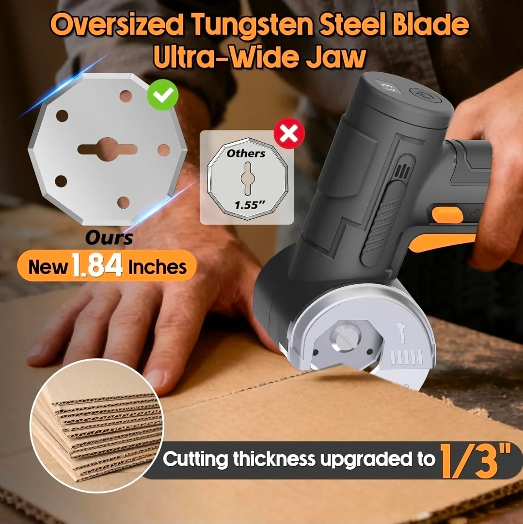 This cordless electric scissor features an enhanced motor with 320 RPM cutting speed. It has a safety lock for anti-misoperation and an LED light for clearer viewing. The oversized tungsten steel blade has a 1.84-inch jaw and can cut materials up to 1/3" thick, including cardboard, carpet, fabric, leather, paper, and plastics. Easy one-step disassembly and magnetic accessory storage make it convenient to use.